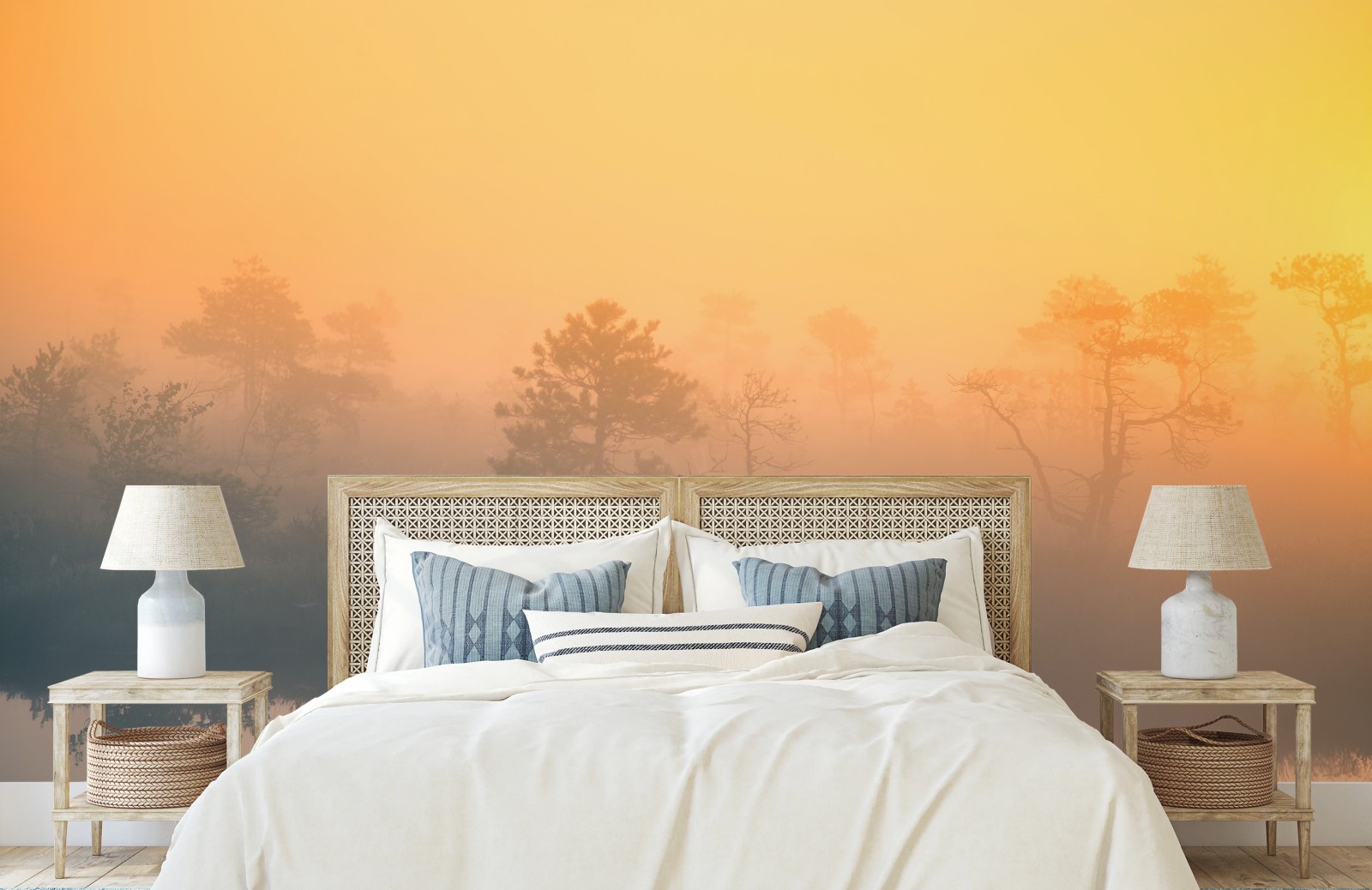 Fototapeta Senny wschód słońca nad mglistym torfowiskiem