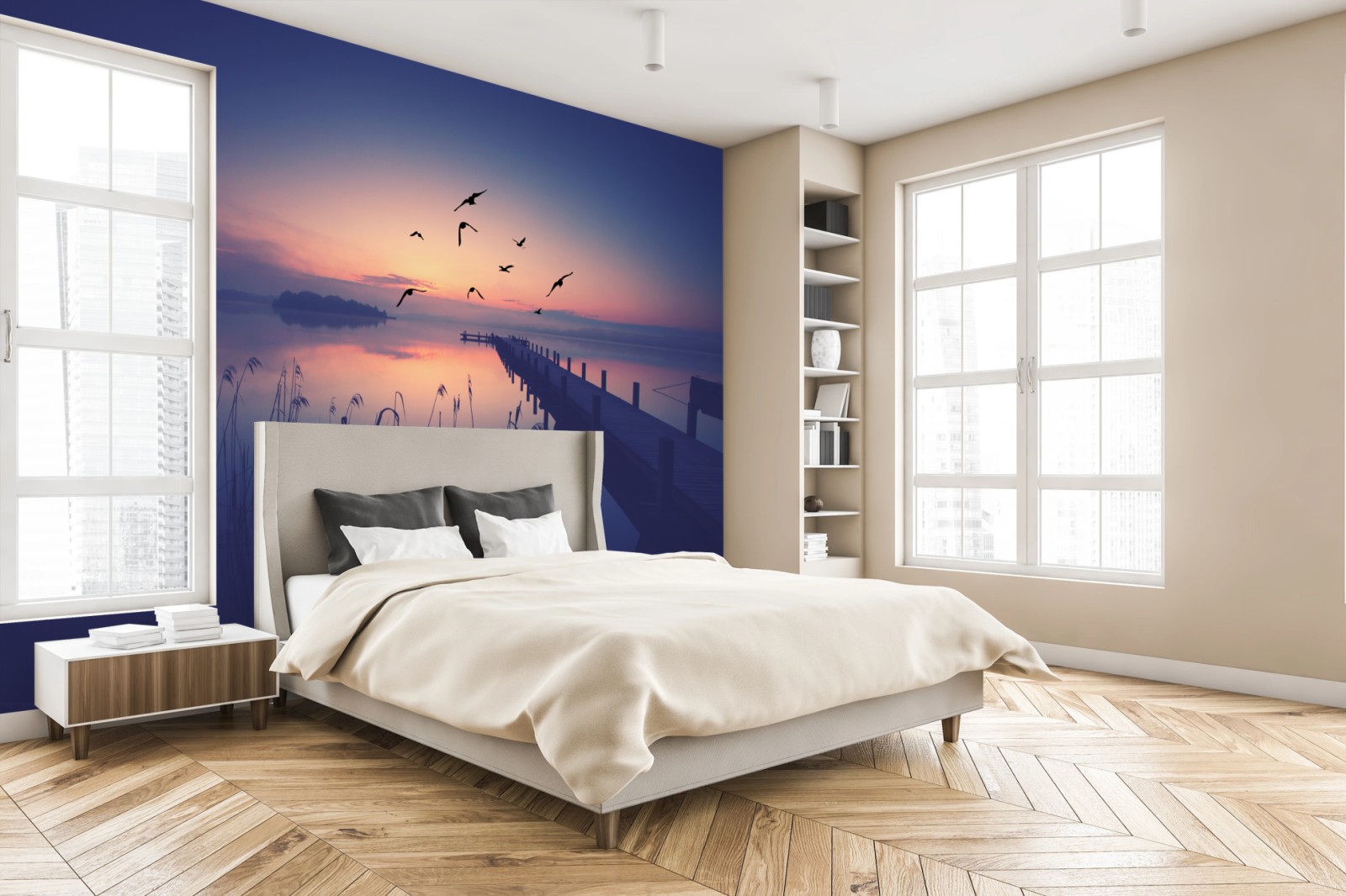 Fototapeta Spokojny wschód nad jeziorem z ptakami