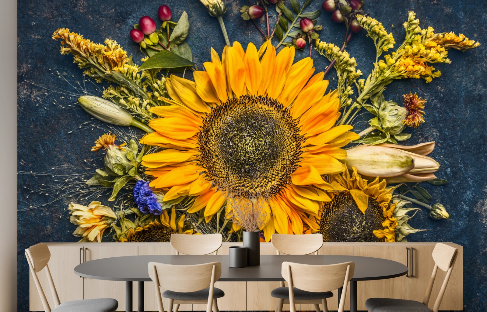 Fototapeta Jesienny bukiet słoneczników na ciemnym rustykalnym tle