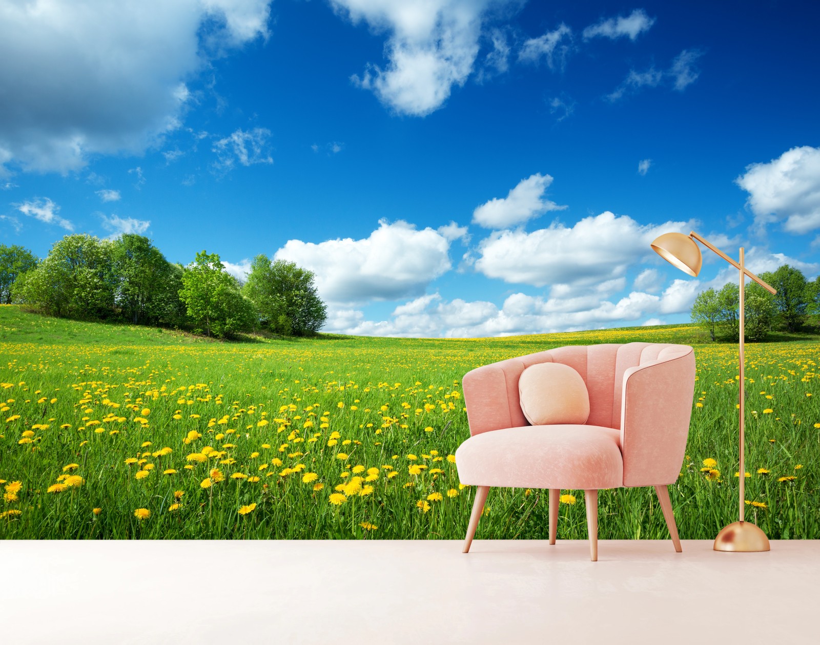 Fototapeta Słoneczna łąka z mniszkami i błękitnym niebem