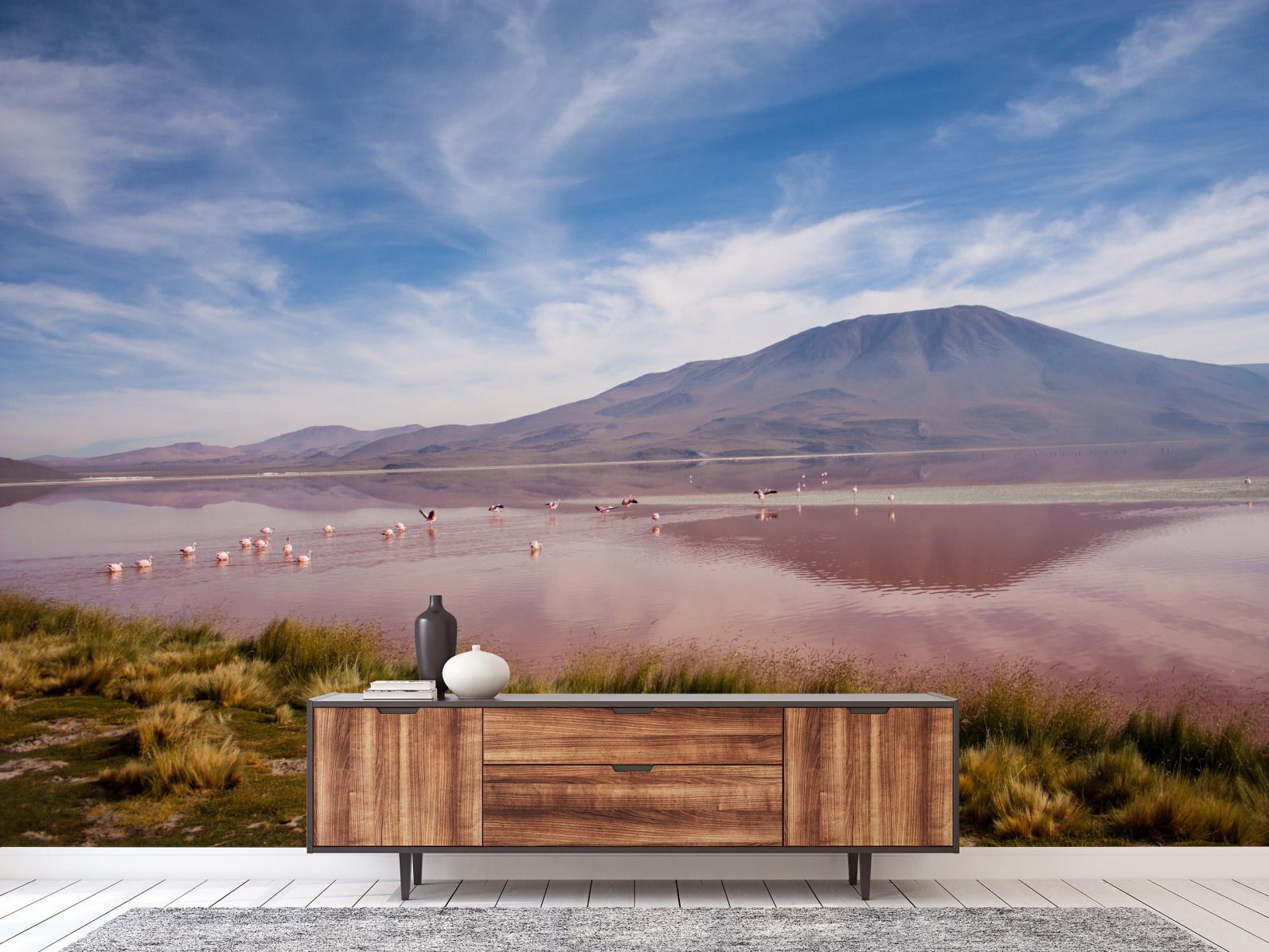 Fototapeta Różowa laguna z flamingami i odbiciem gór