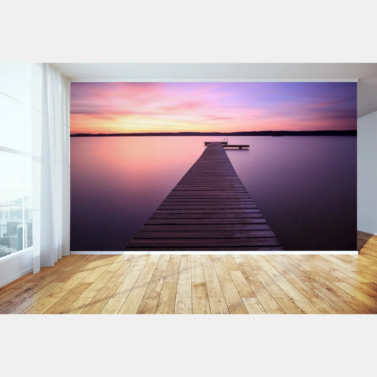 Fototapeta Spokojny pastelowy zachód nad jeziorem z pomostem