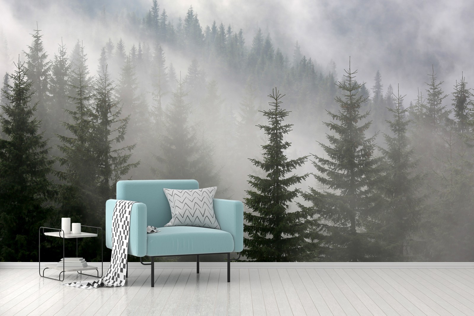 - krajobraz, drzewa, spokój, przyroda, mgła, las sosnowy, iglasty, atmosferyczny, poranne, górski