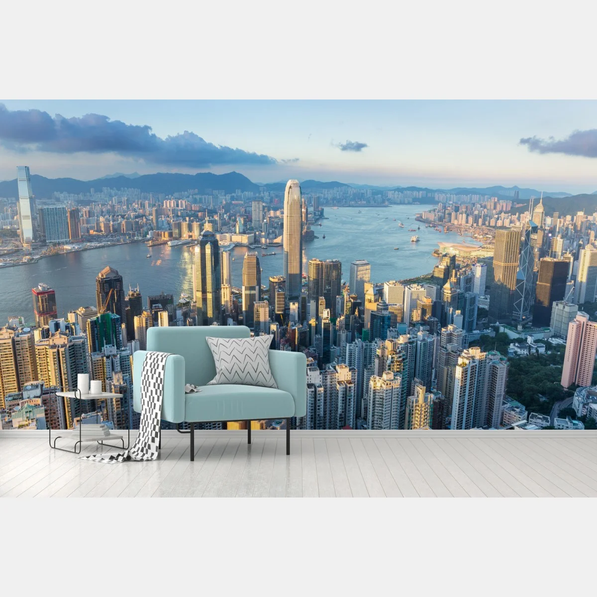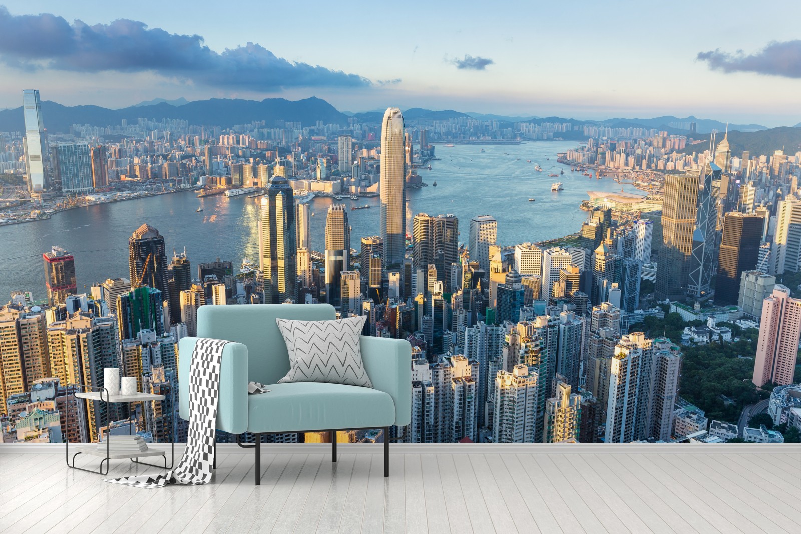 - panorama, panorama miasta, architektura, drapacze chmur, miejski, zachód słońca, port, widok z lotu ptaka, nowoczesne miasto, hong kong