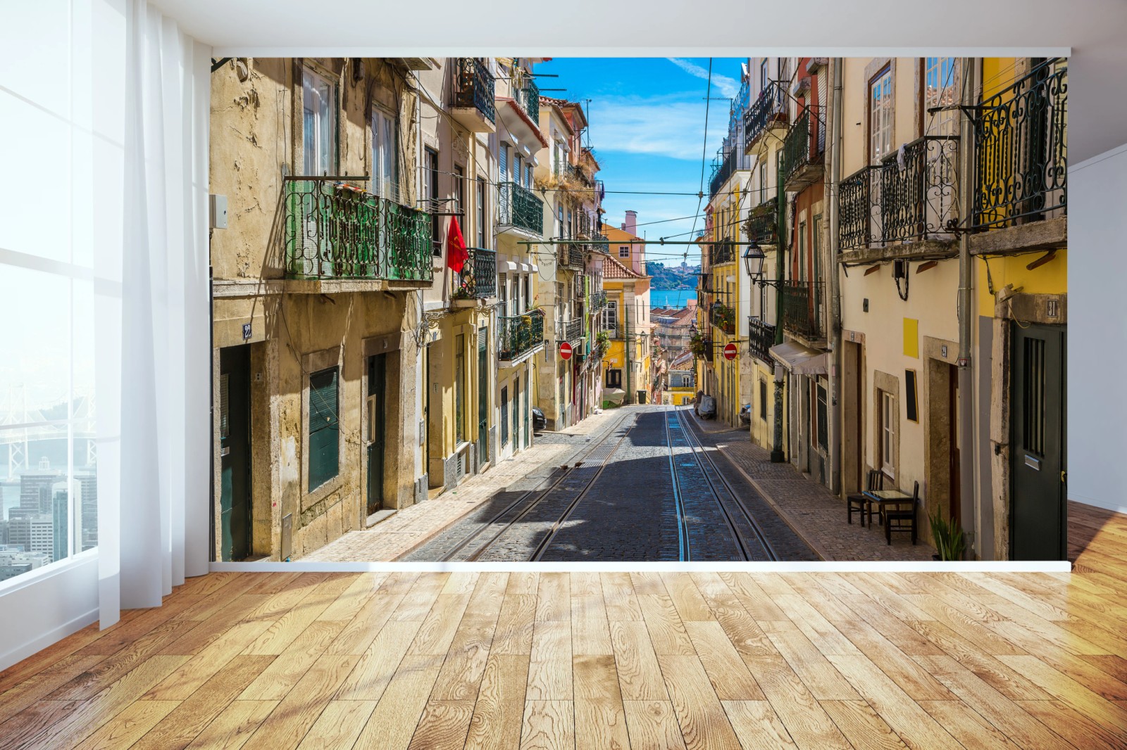 - podróże, lato, portugalia, widok na morze, ulica, kolorowe budynki, bruk, lizbona, tory tramwajowe, balkony