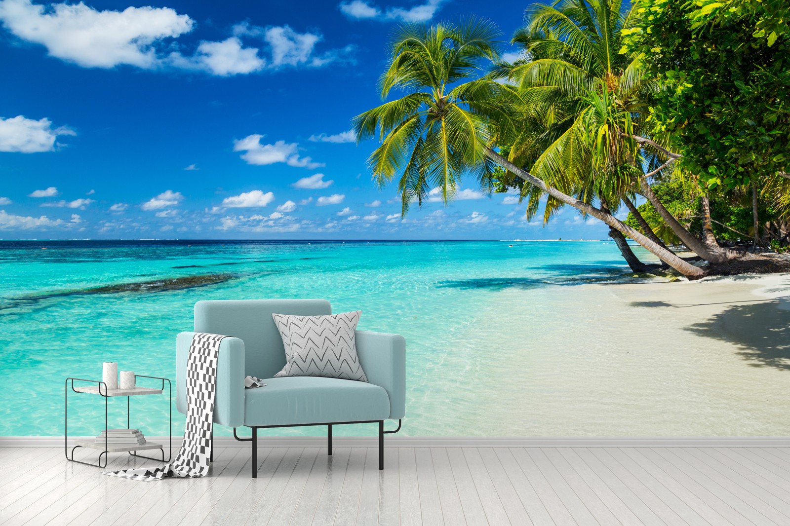 Fototapeta Tropikalna turkusowa plaża z pochylonymi palmami