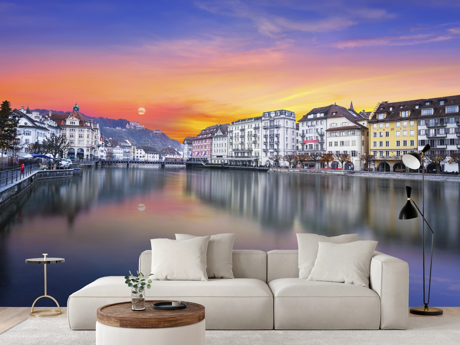 - panorama, odbicie, zachód słońca, miasto, szwajcaria, zmierzch, nabrzeże, zabytkowe budynki, lucerna, rzeka reuss
