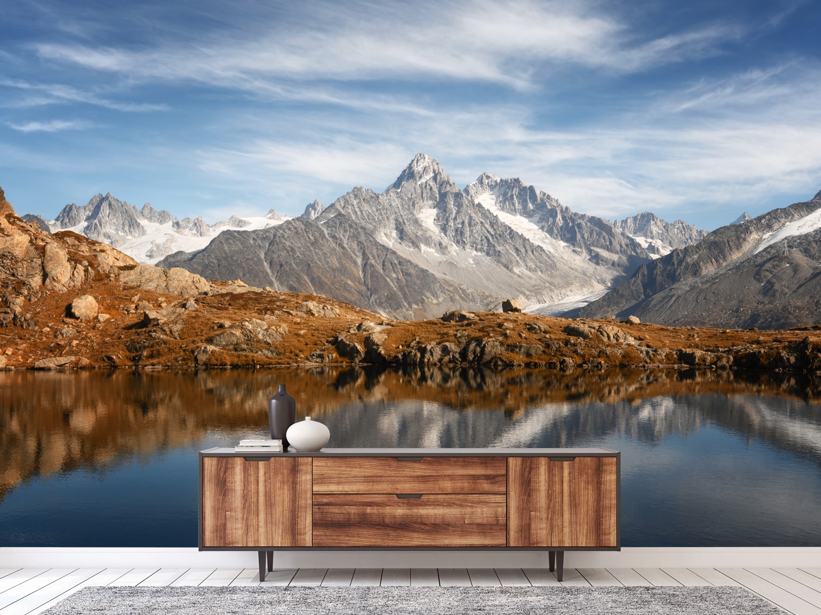 Fototapeta Spokojne alpejskie szczyty odbite w jeziorze