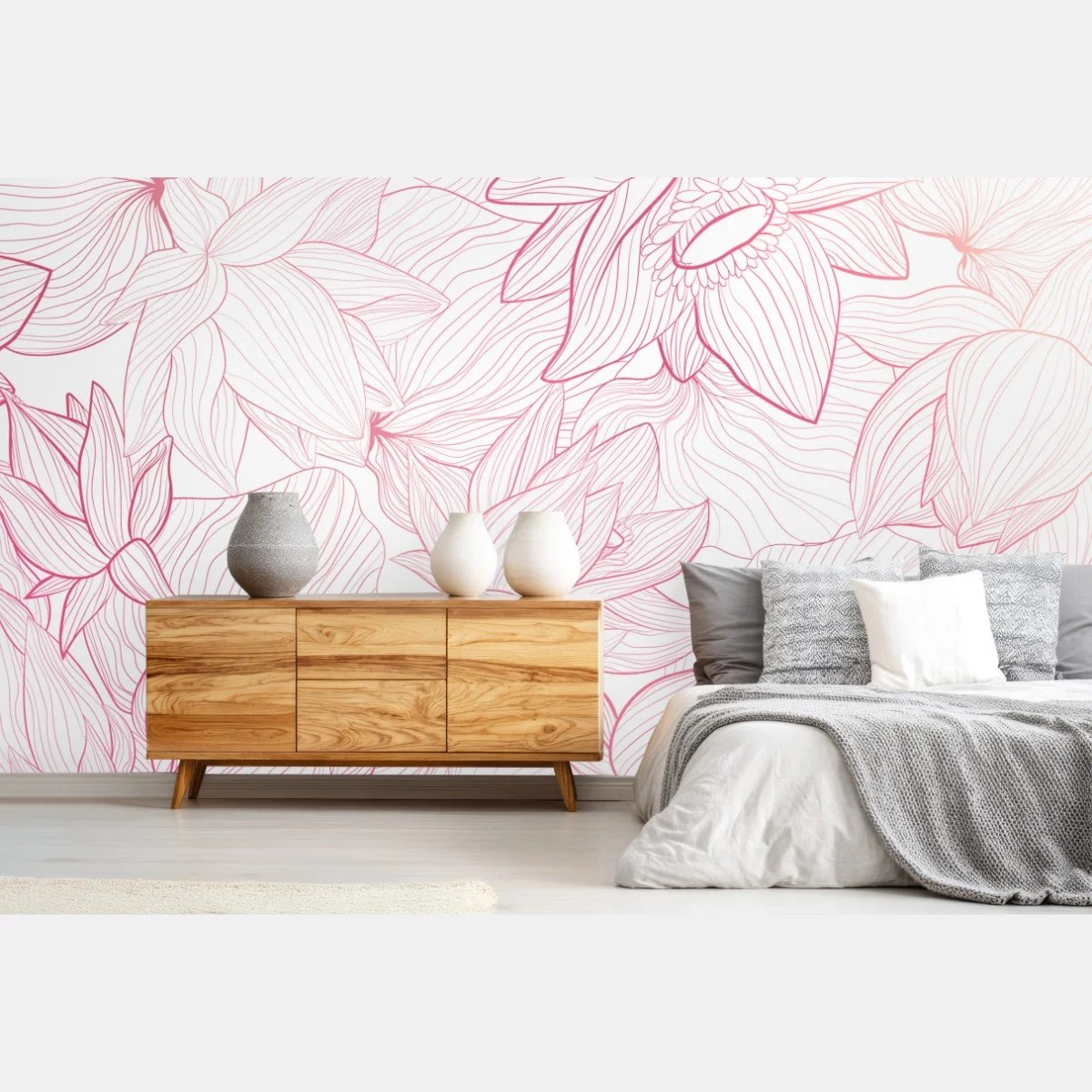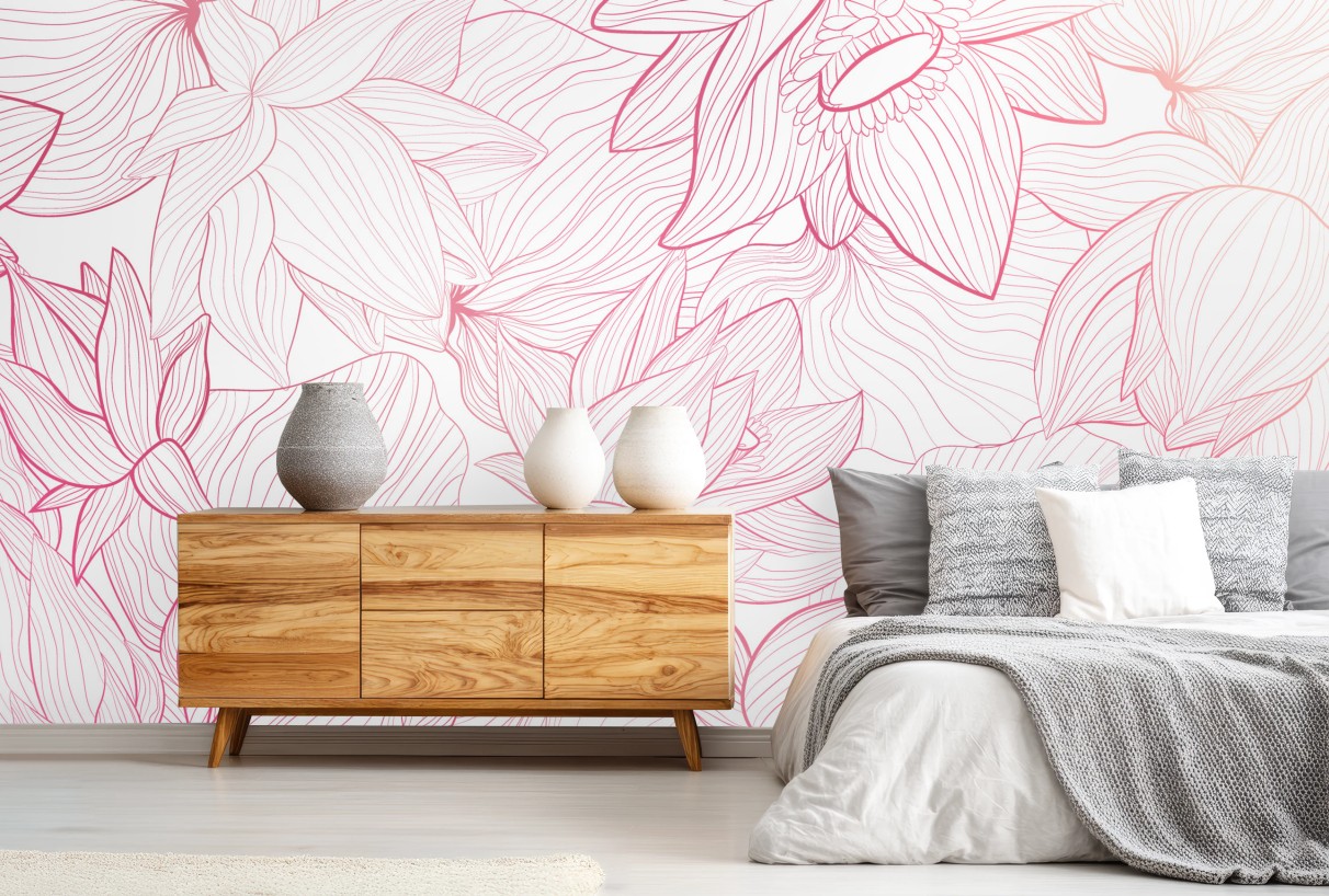 - dekoracja ścienna, botaniczny, wzór, kwiatowy, rysunek liniowy, różowy, kwiaty, delikatny, minimalny, ozdobny