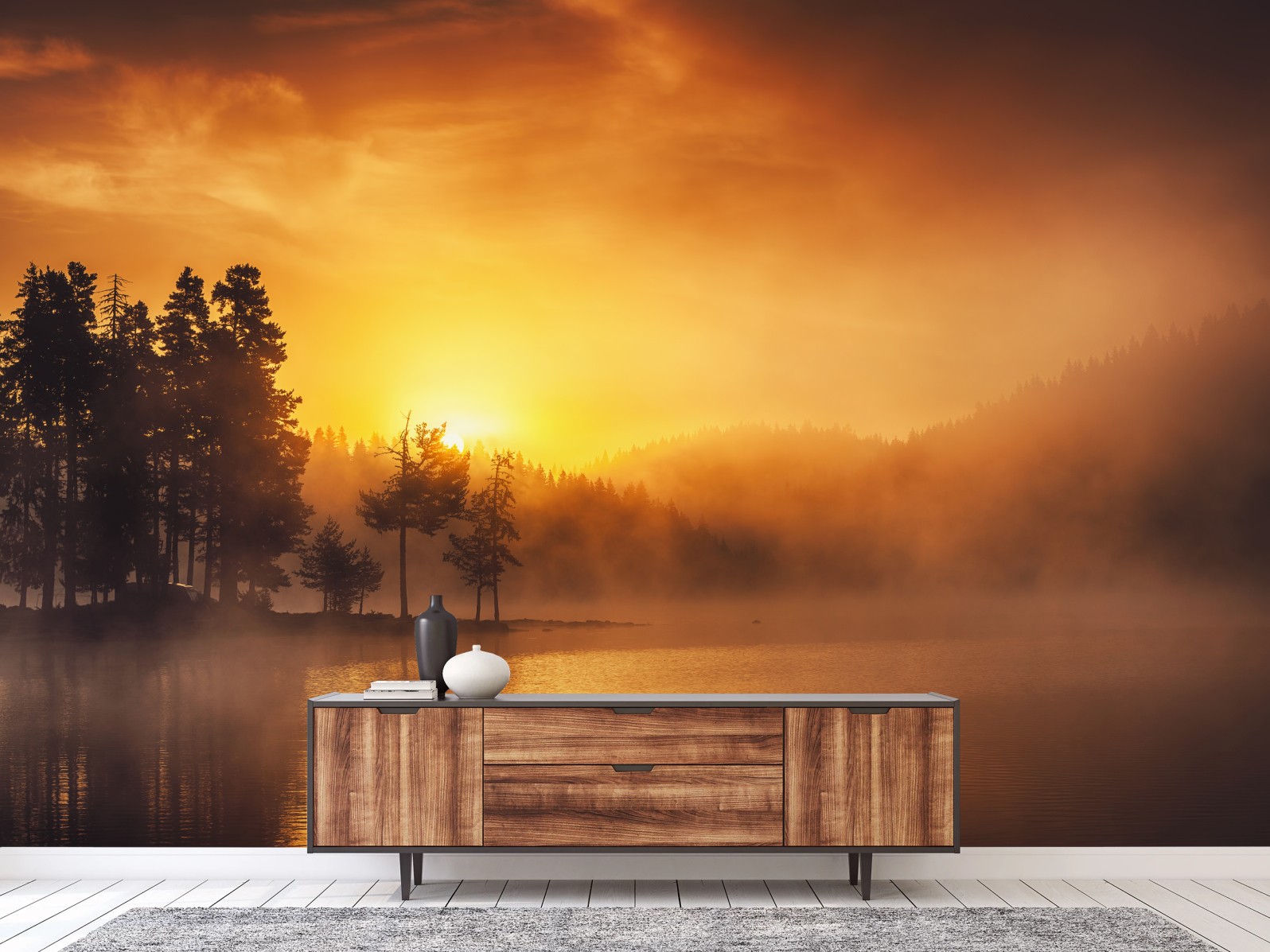 Fototapeta Złoty wschód słońca nad mglistym jeziorem