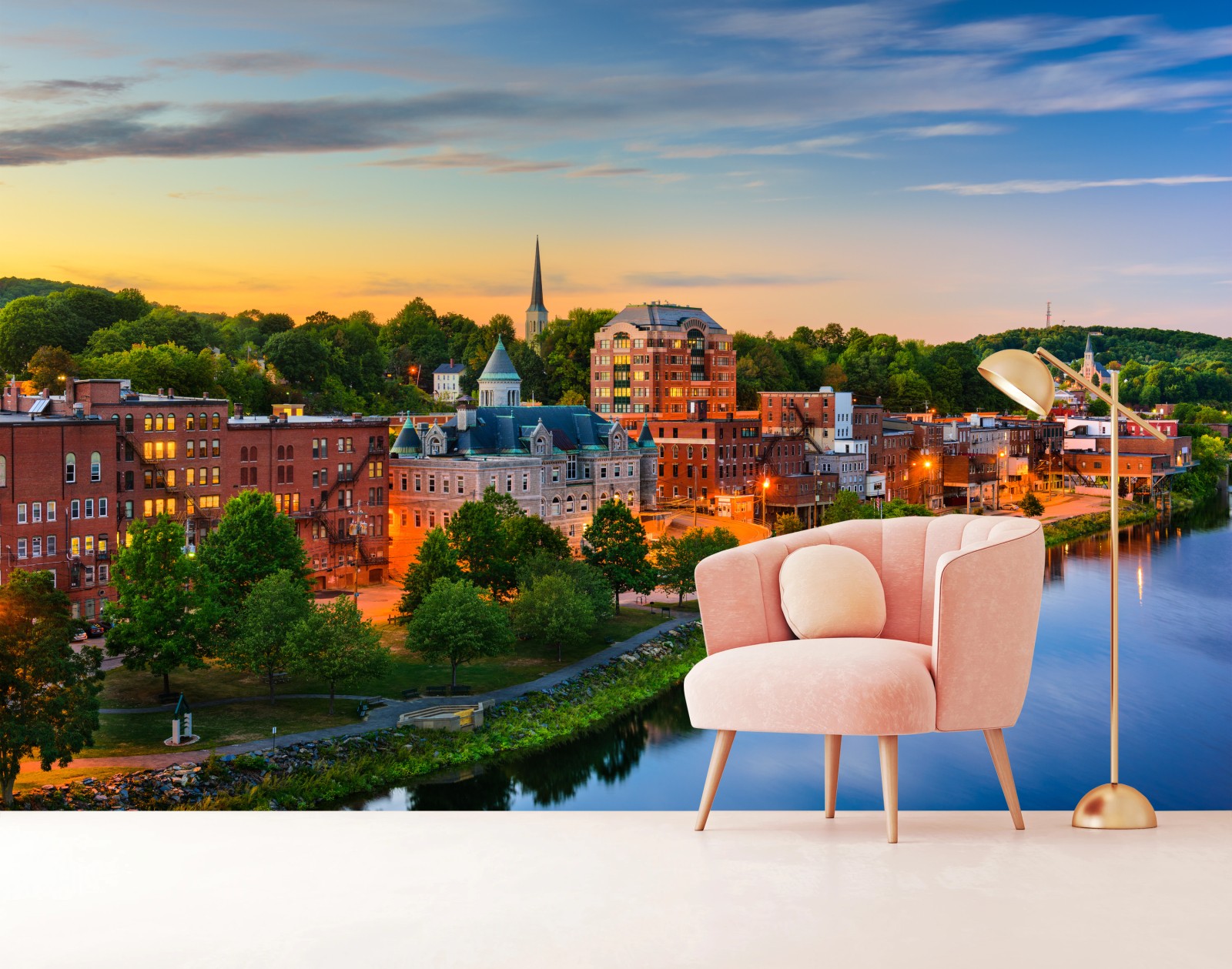 Fototapeta Augusta panorama miasta przy rzece Kennebec o zachodzie słońca