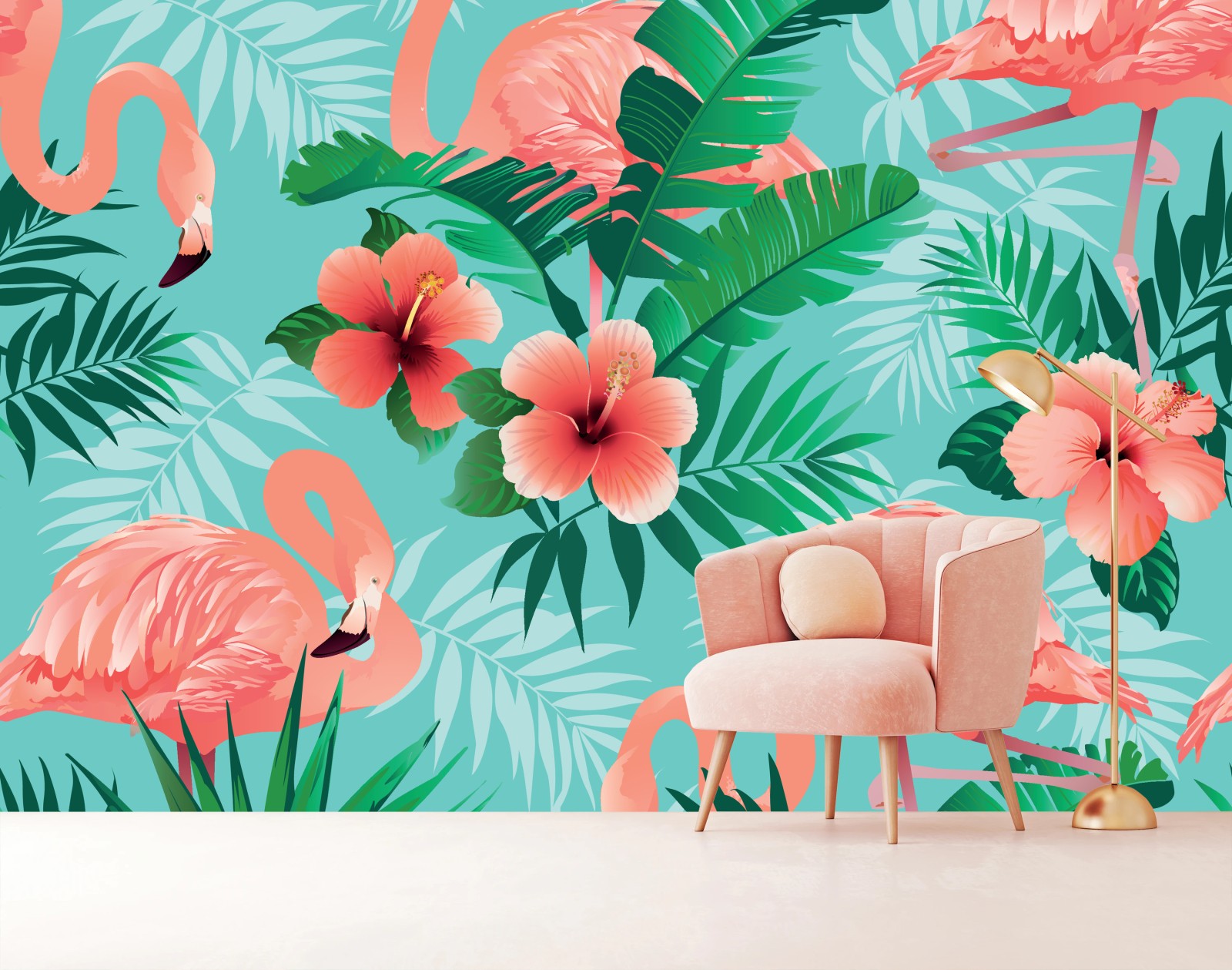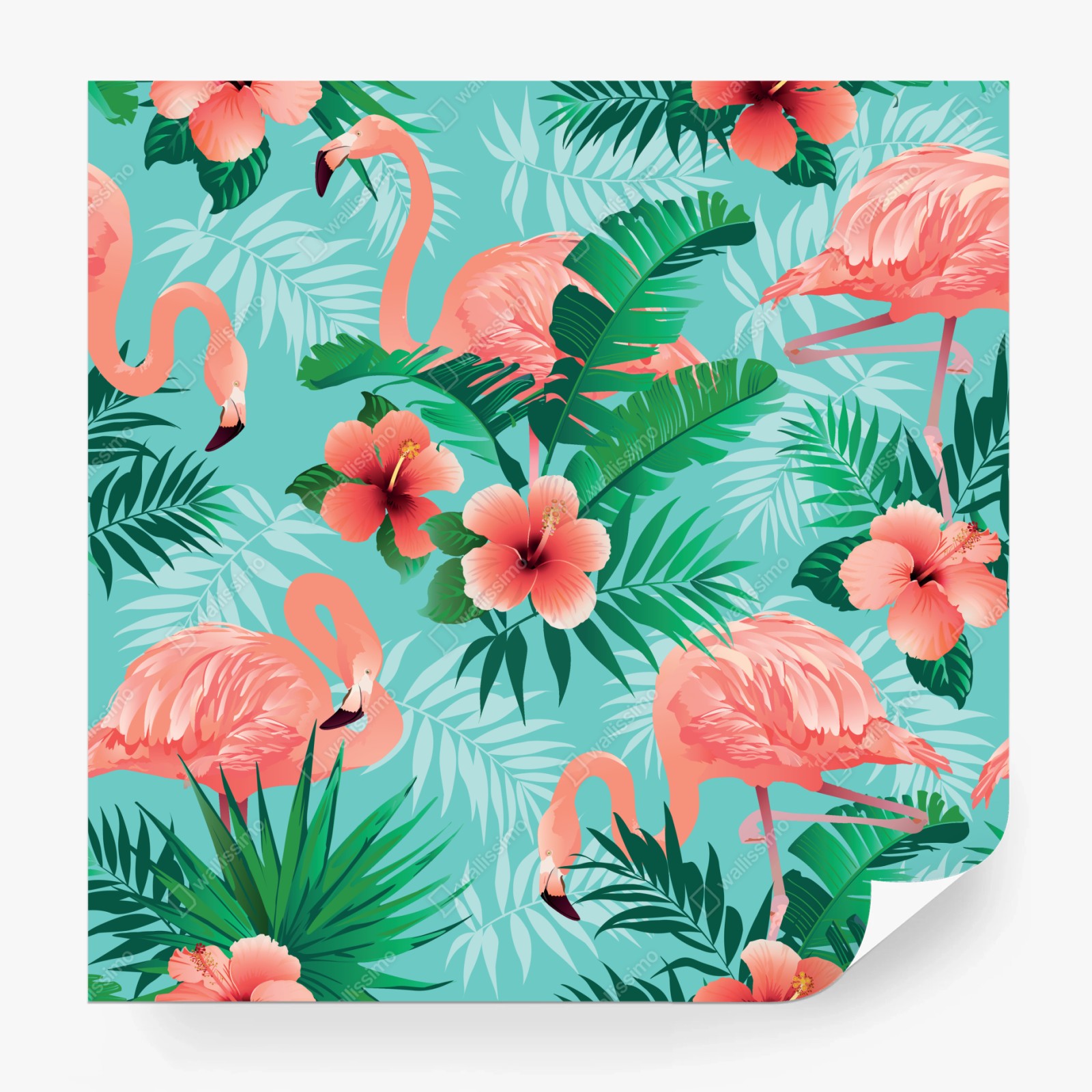 - botaniczny, wzór, tropikalny, hibiskus, liście, egzotyczny, lato, palma, plaża, flamingi