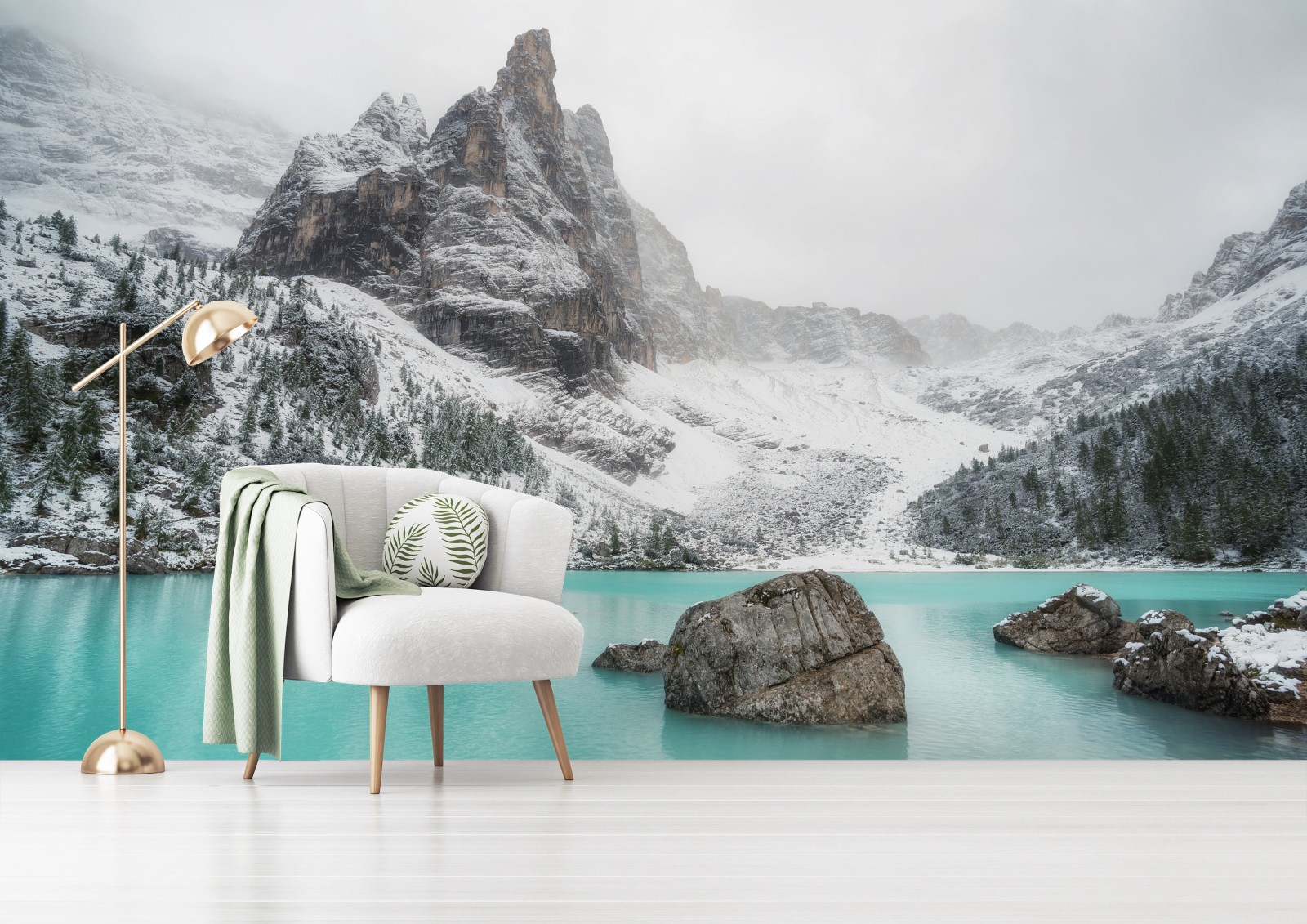 Fototapeta Turkusowe jezioro alpejskie pod ośnieżonymi szczytami