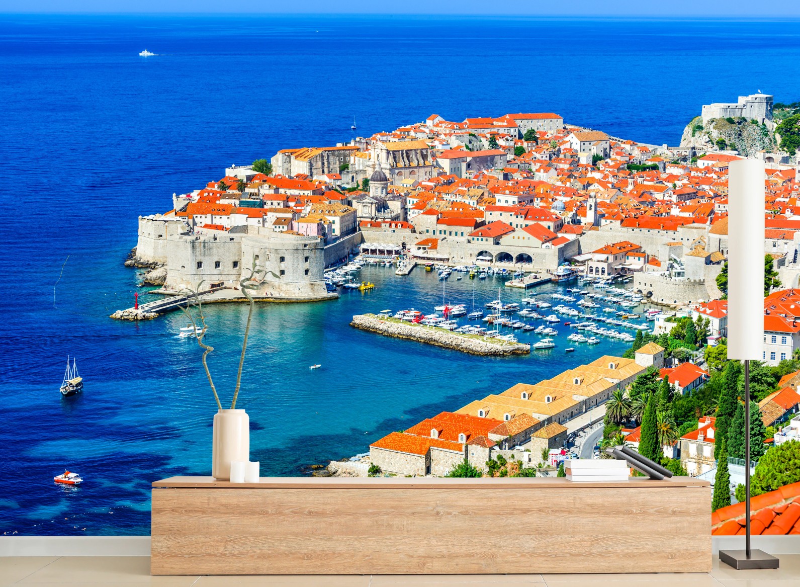 - panorama miasta, wybrzeże, port, stare miasto, chorwacja, czerwone dachy, adriatyk, dubrownik, mury obronne, błękitne morze