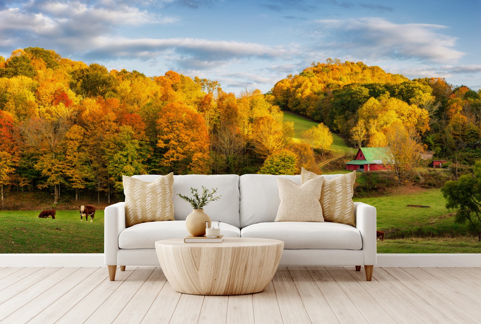 Fototapeta Jesienny krajobraz wiejski z czerwoną stodołą