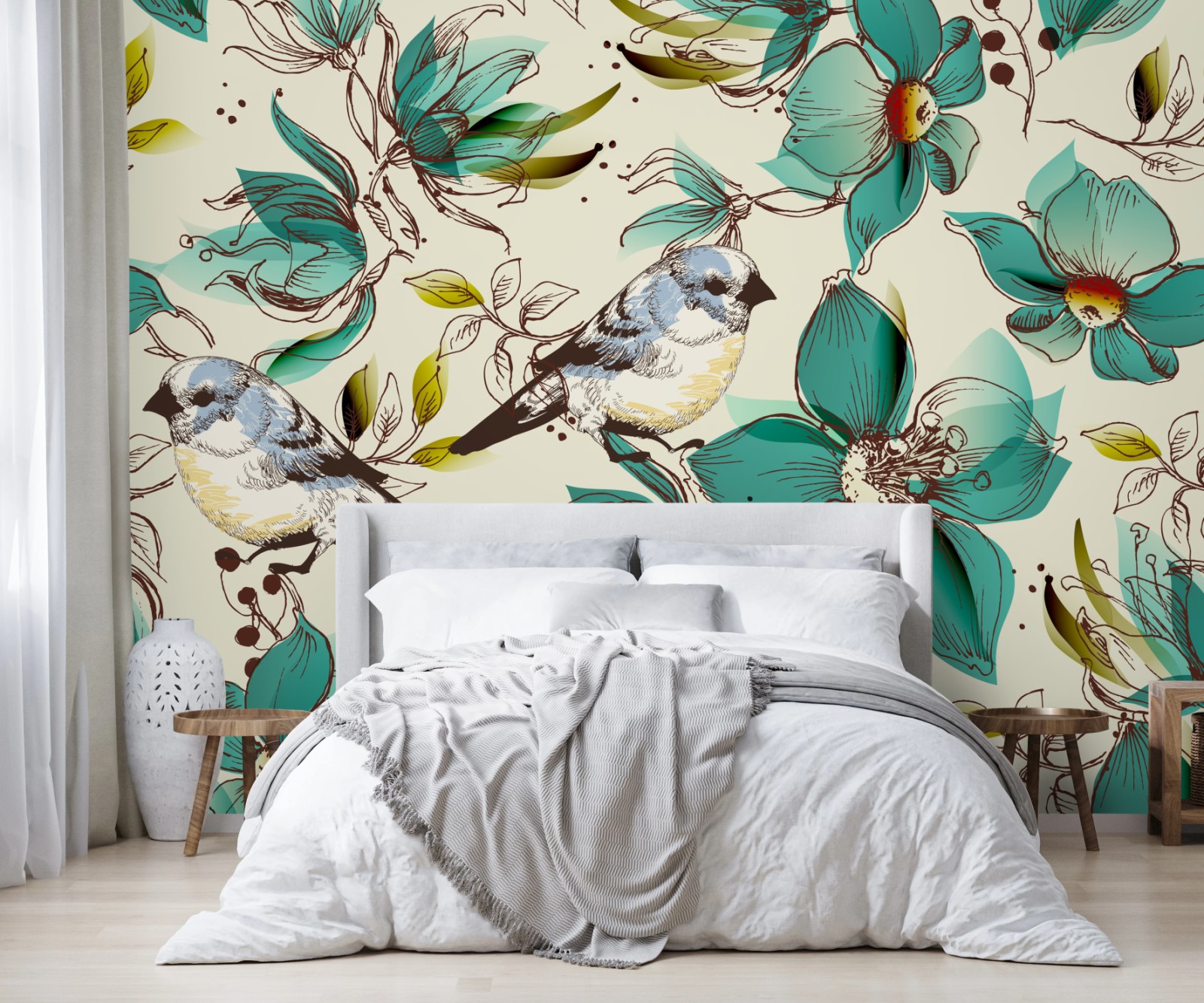 Fototapeta Retro miętowy wzór kwiatów i ptaków
