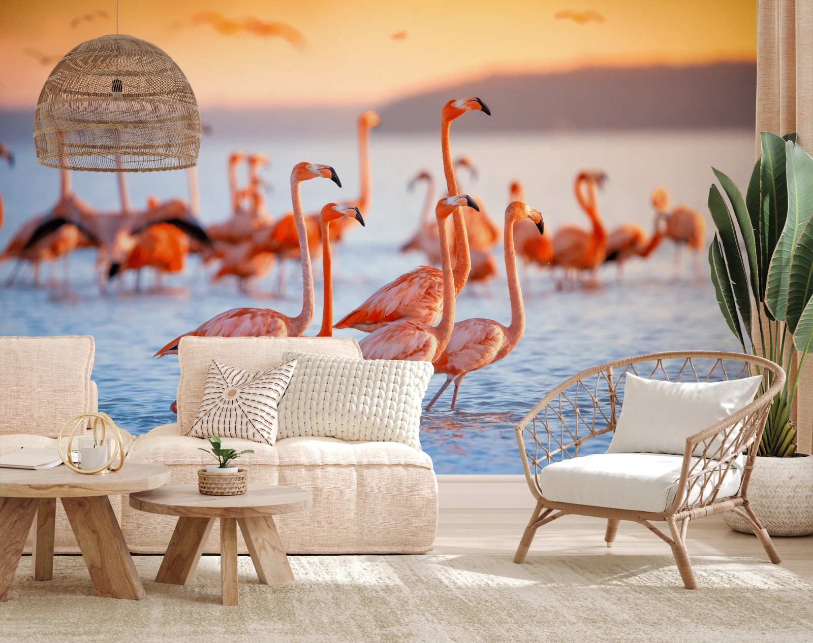 - natura, tropikalny, jezioro, różowy, ptaki, woda, zachód słońca, flamingi, dzika przyroda, stado
