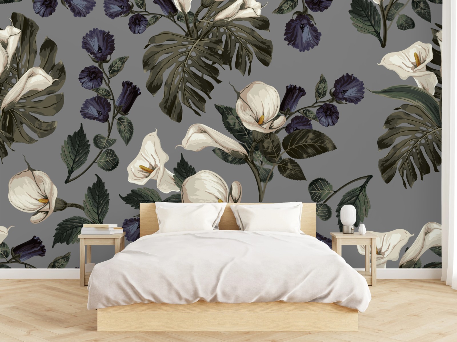 Fototapeta Botaniczny wzór: delikatne kalie i liście monstery na szarym tle