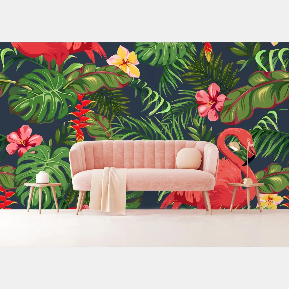 - monstera, botaniczny, wzór, tropikalny, hibiskus, liście, egzotyczny, lato, ptaki, flamingi