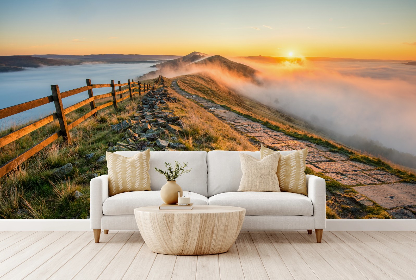 Fototapeta Wschód słońca nad mglistym grzbietem z kamienną ścieżką