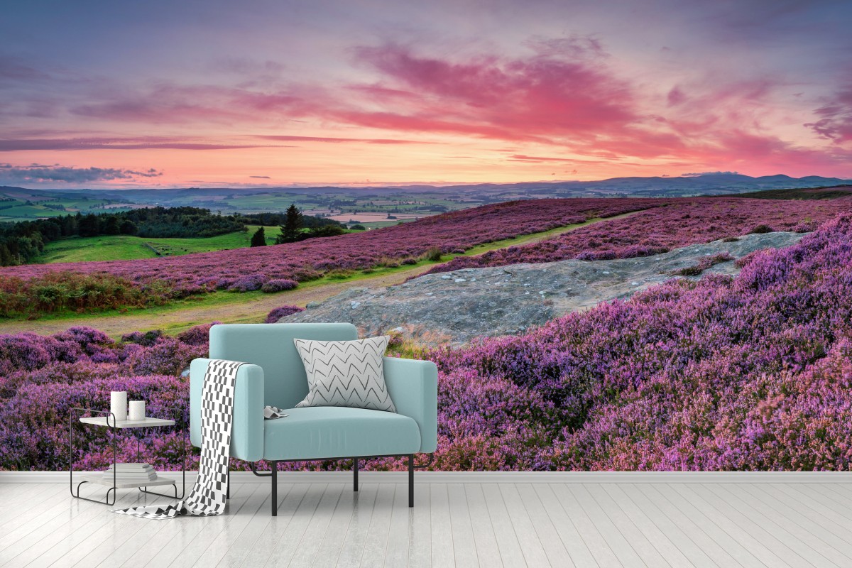 Fototapeta Fioletowe wrzosowiska o zachodzie słońca