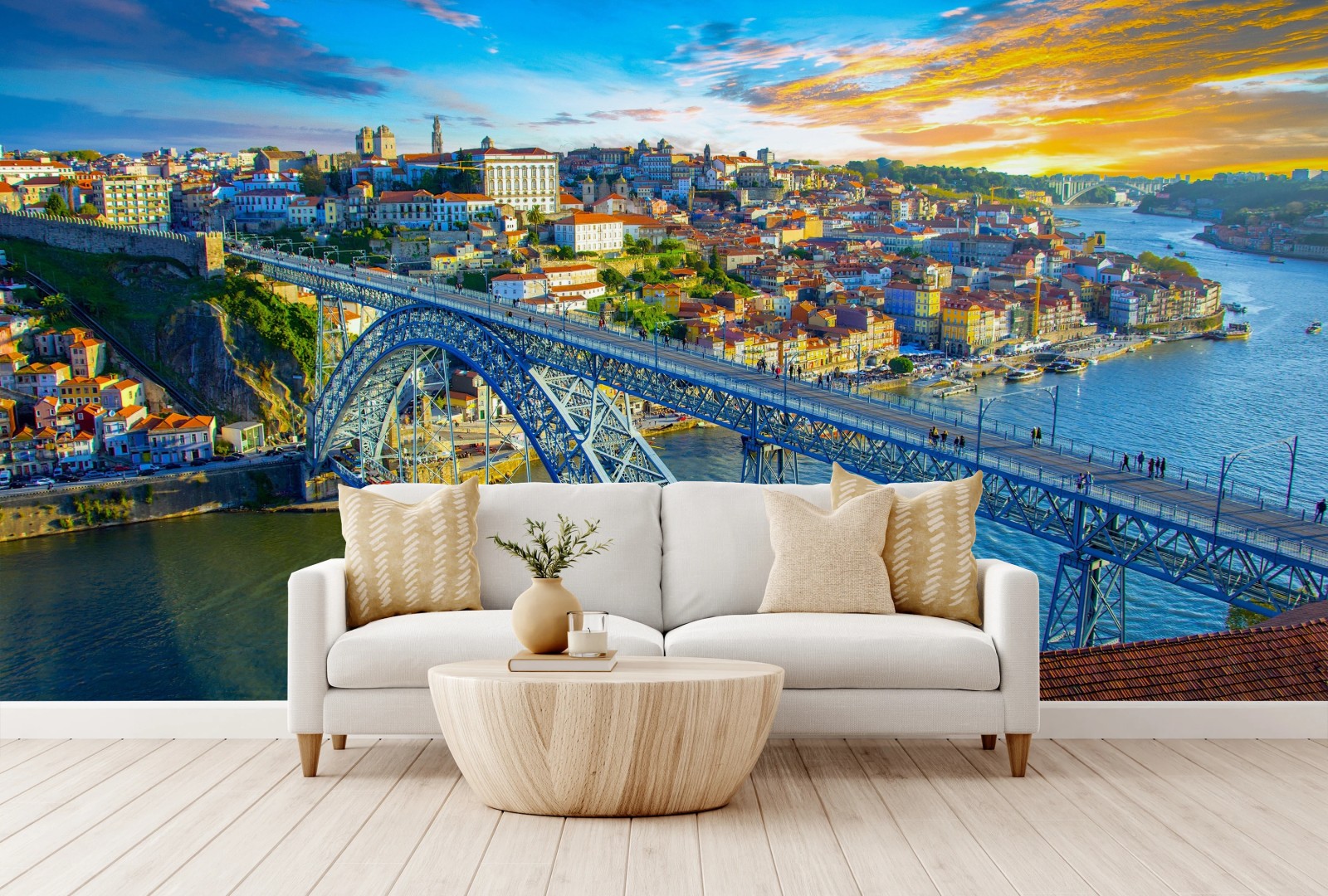 - podróże, panorama miasta, architektura, zachód słońca, rzeka, portugalia, most, porto, most dom luís, douro