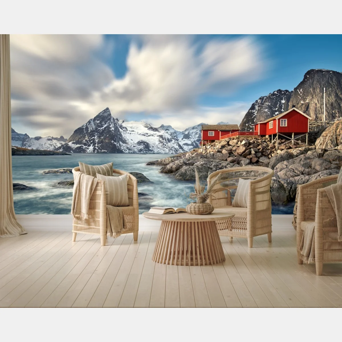 Fototapeta Czerwone domki rybackie przy zaśnieżonych górach
