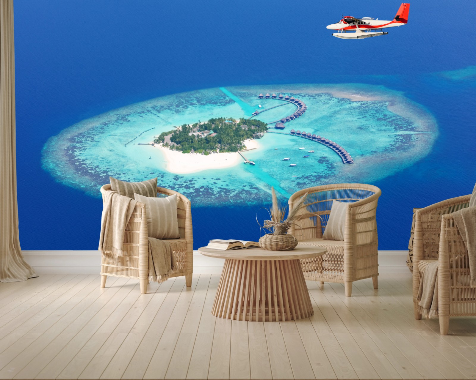 Fototapeta Tropikalna wyspa z lotu ptaka i wodnosamolotem