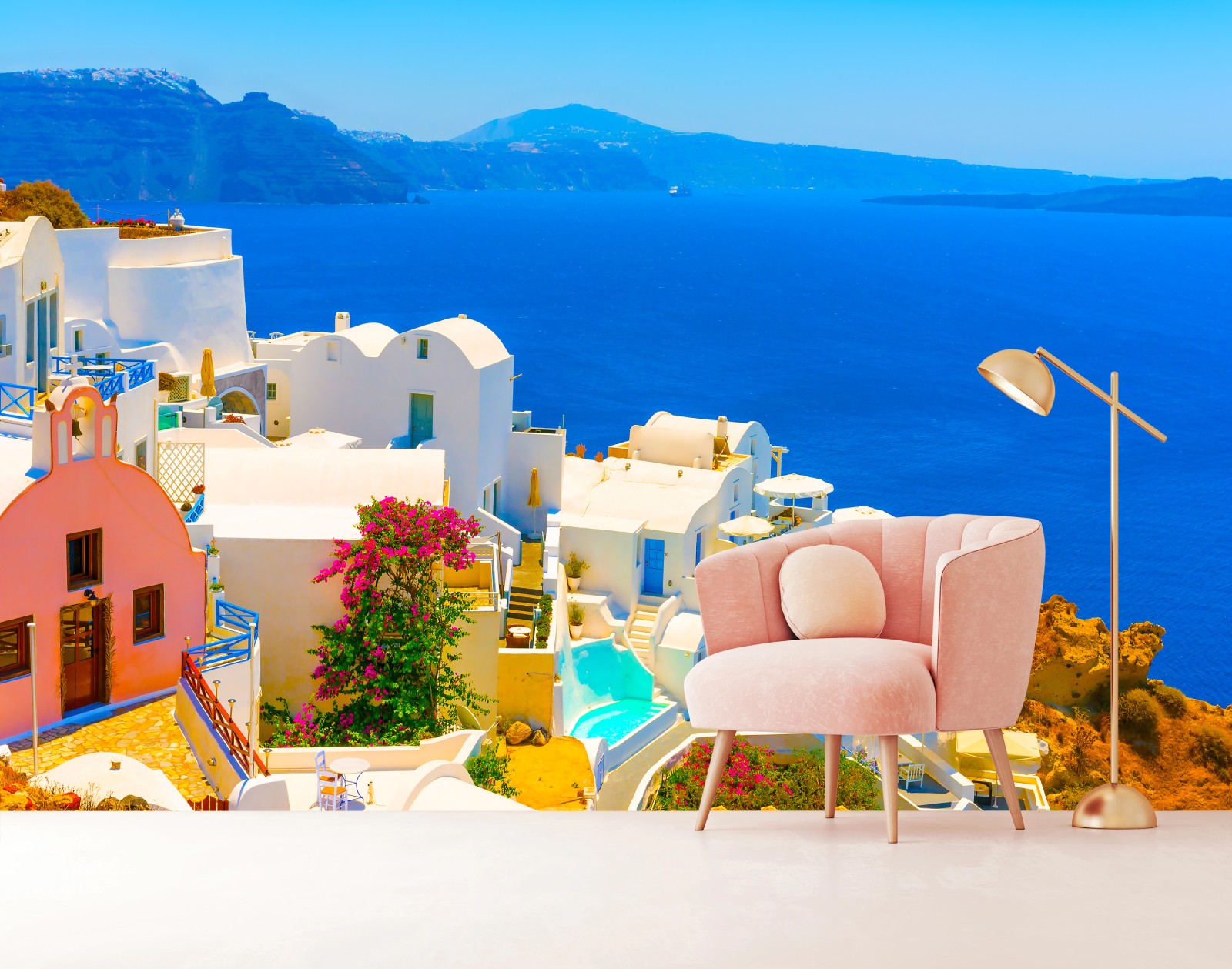 Fototapeta Słoneczny widok na Santorini: białe domy i błękit morza