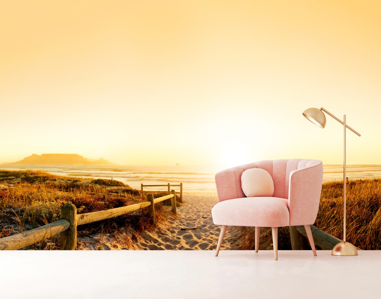 Fototapeta Złota panorama zachodu słońca nad plażą z Górą Stołową
