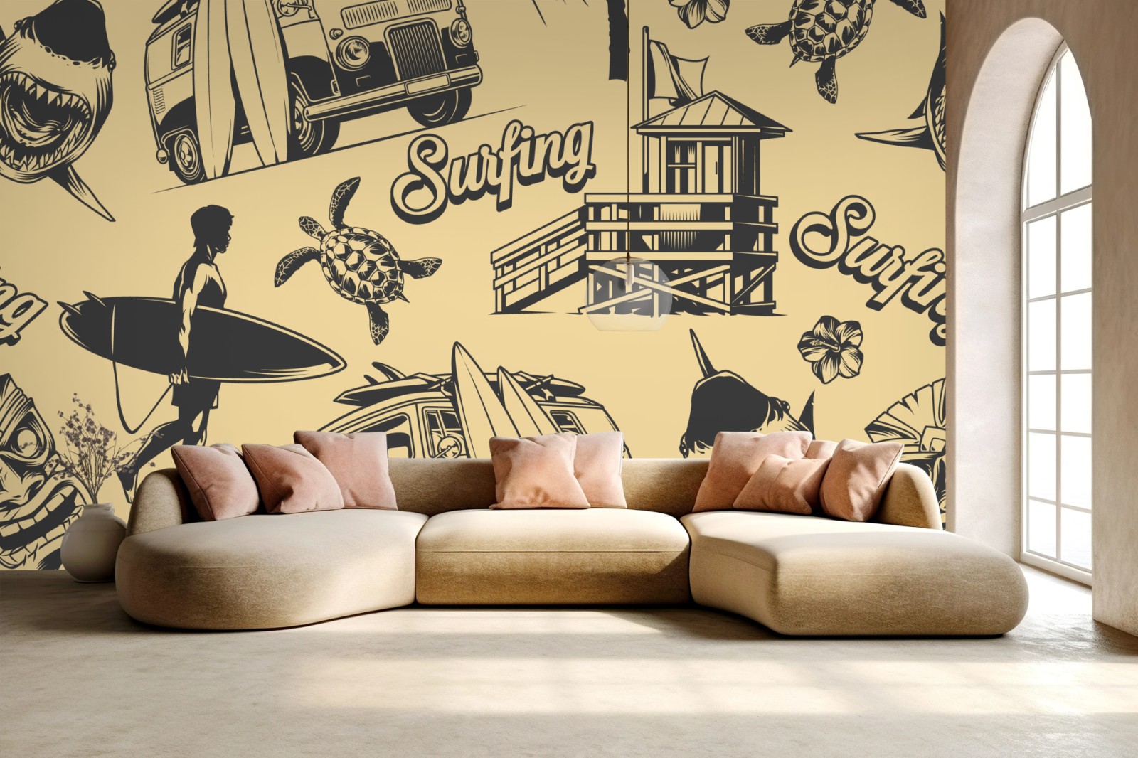 Fototapeta Retro wzór surfingowy z furgonetką i falami
