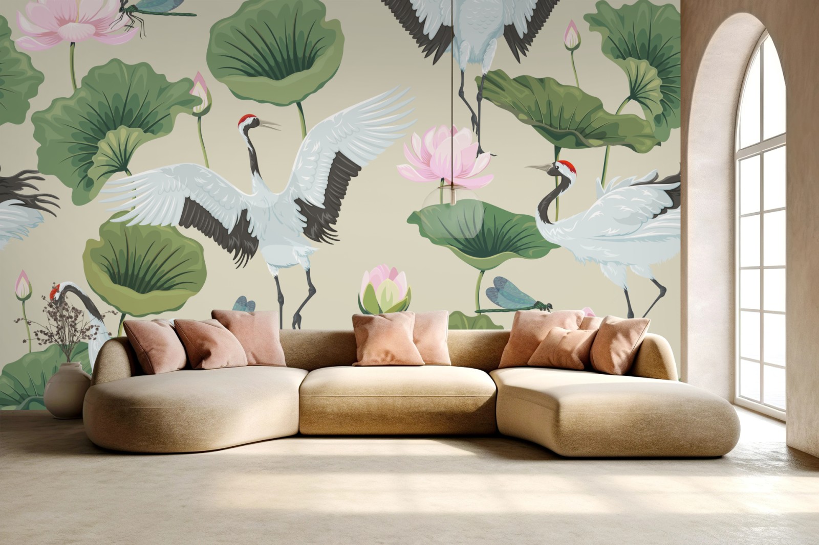 Fototapeta Elegancki wzór z żurawiami i lotosami