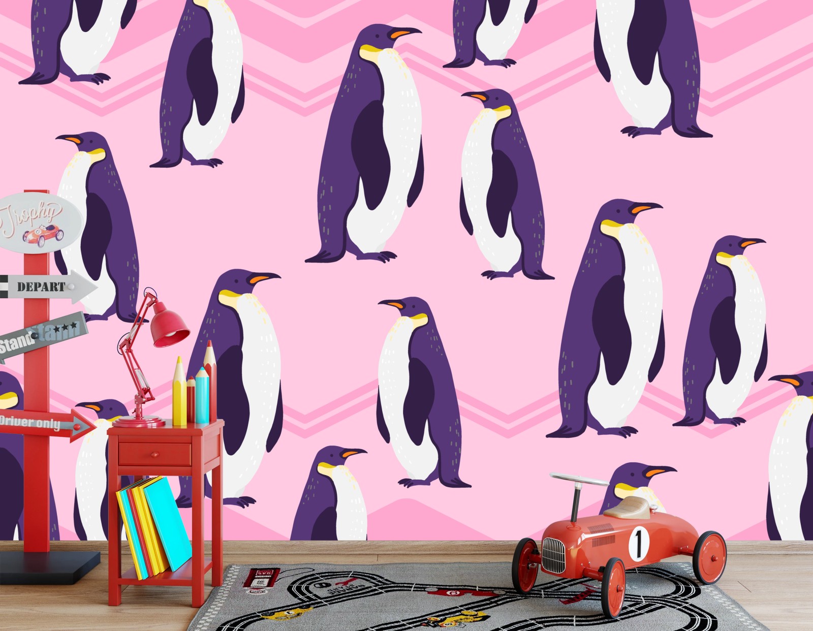 Fototapeta Zabawny wzór z fioletowymi pingwinami na różowym tle