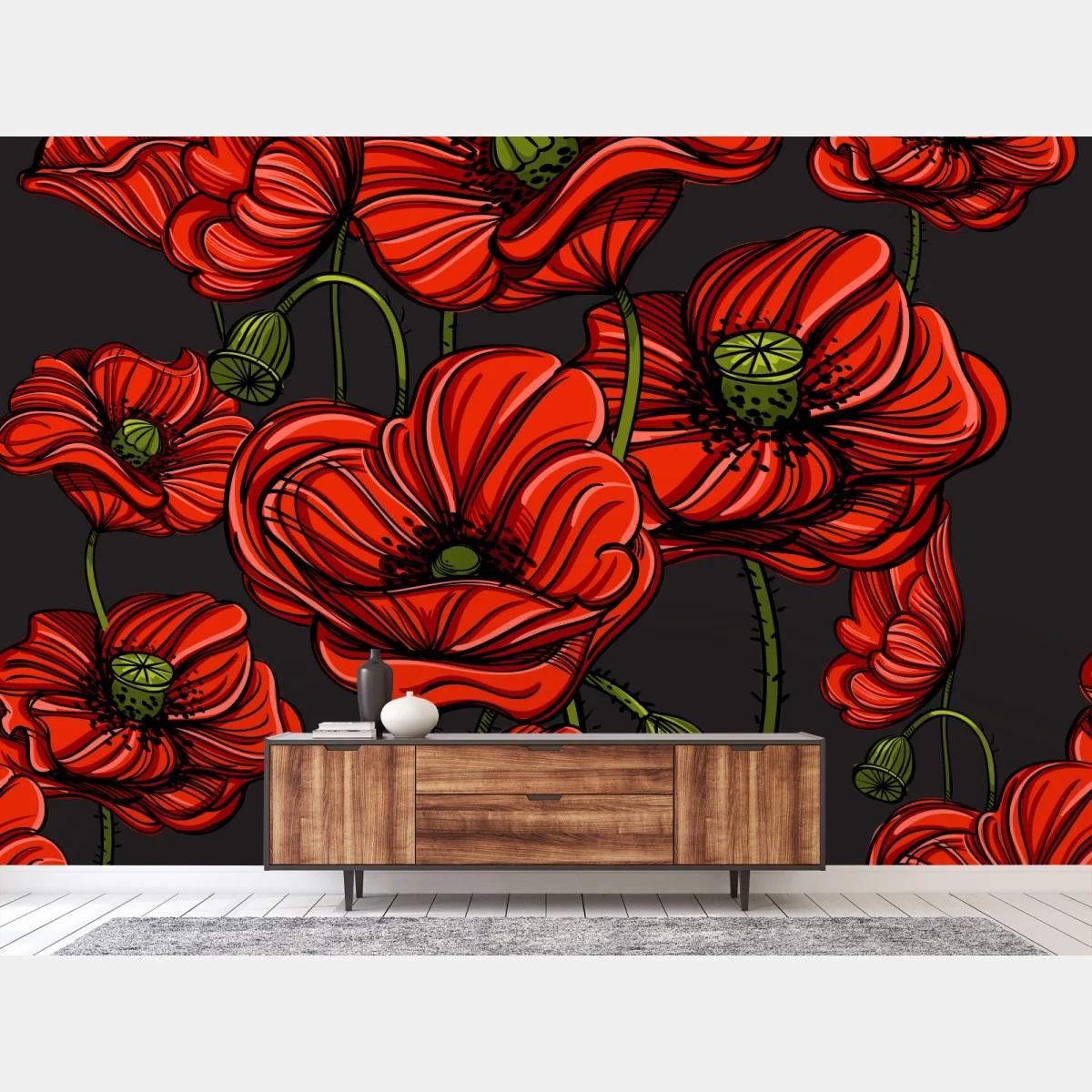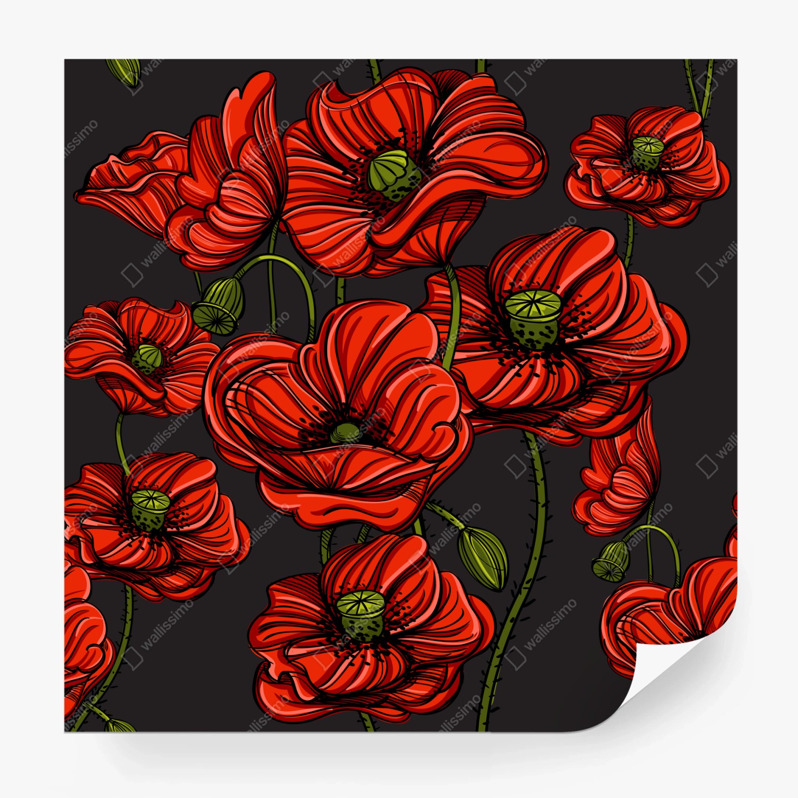 - ilustracja, wzór kwiatowy, botaniczny, natura, dekoracja, bezszwowy wzór, czerwone kwiaty, mak, rysunek ręczny, sztuka kwiatowa