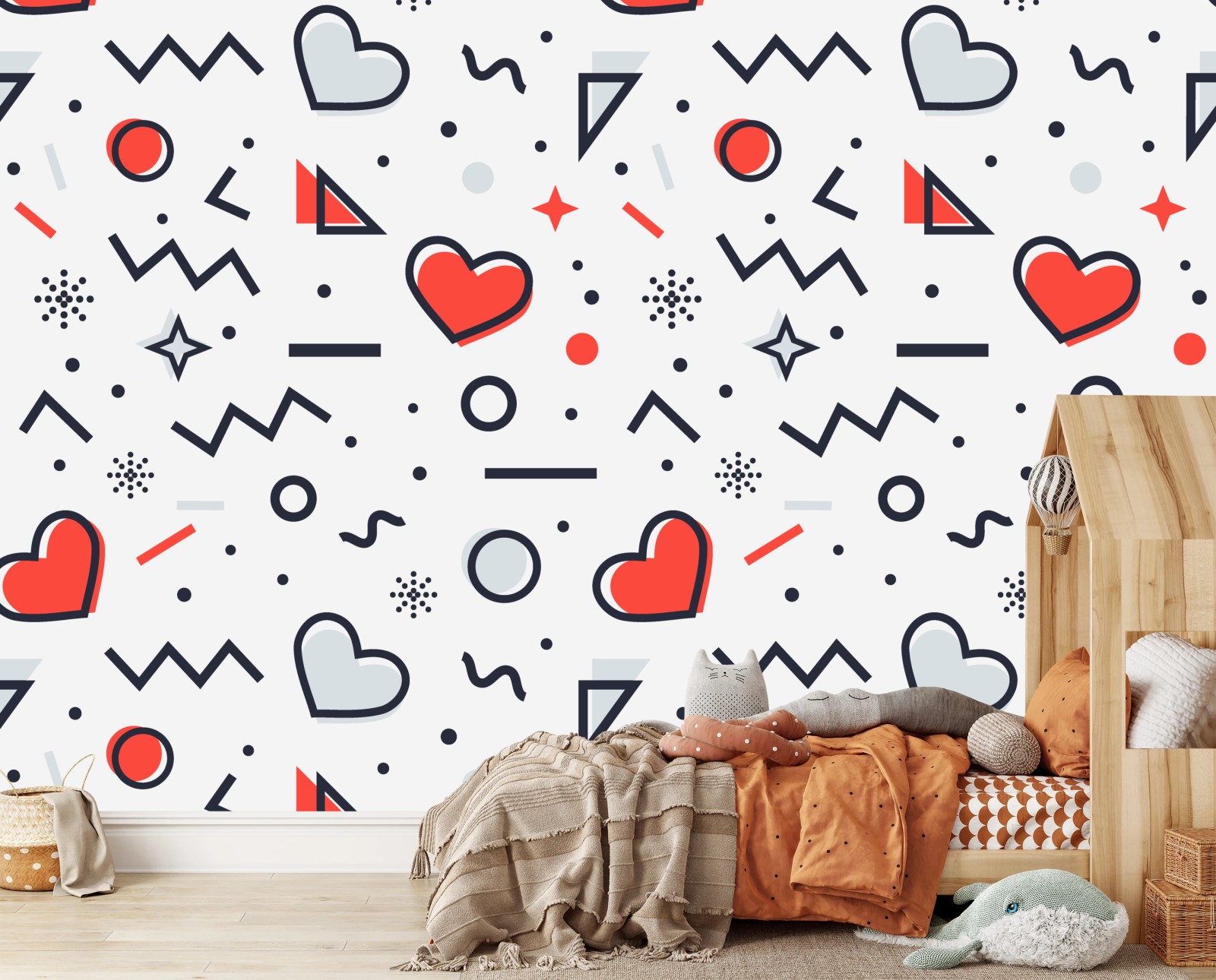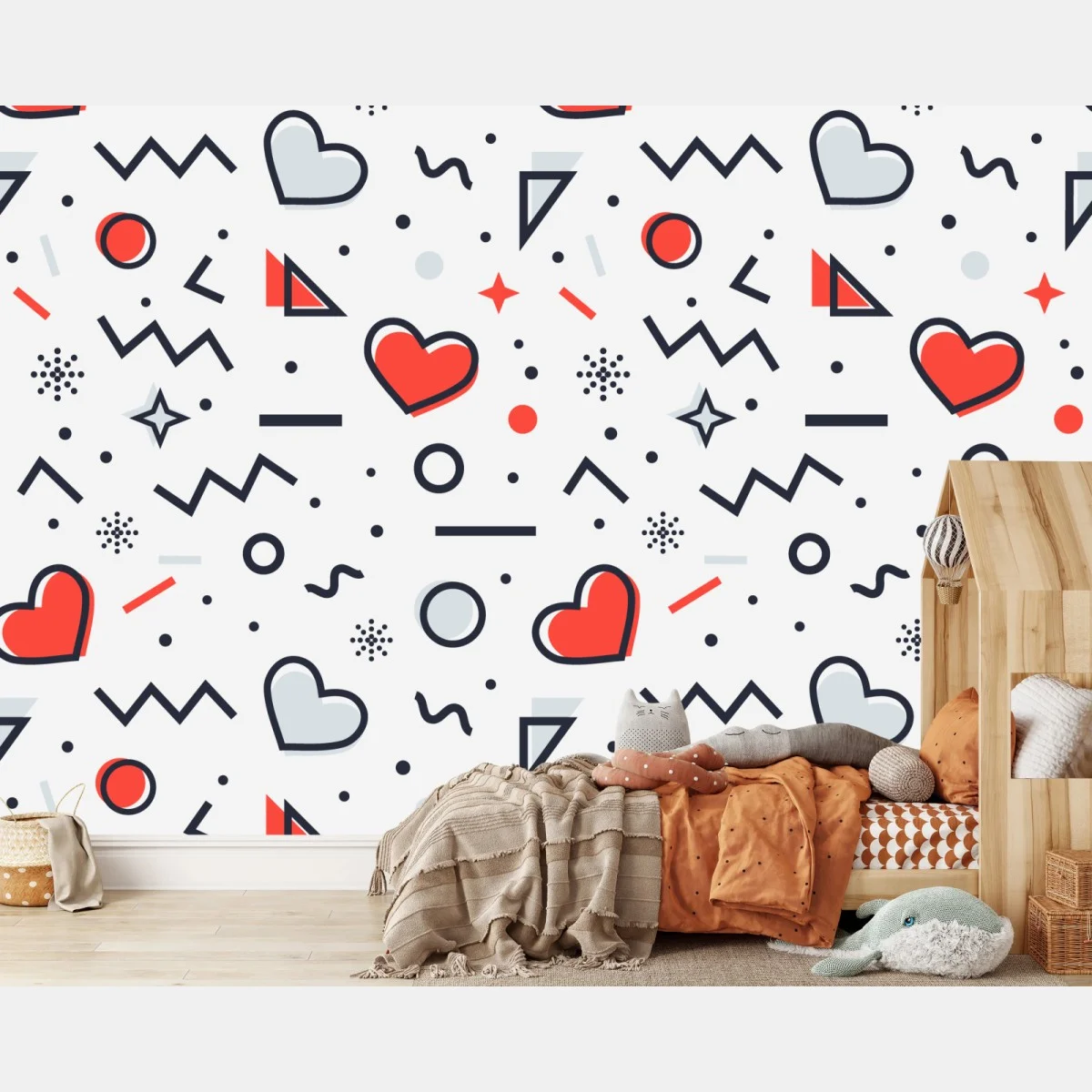 - retro, memphis, abstrakcja, wzór, minimalistyczny, bezszwowy, zabawny, serca, miłość, geometryczne