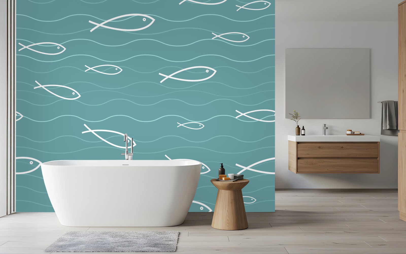- ocean, turkusowy, wzór, minimalistyczny, turkus, dziecięcy, morze, fale, marynistyka, ryby