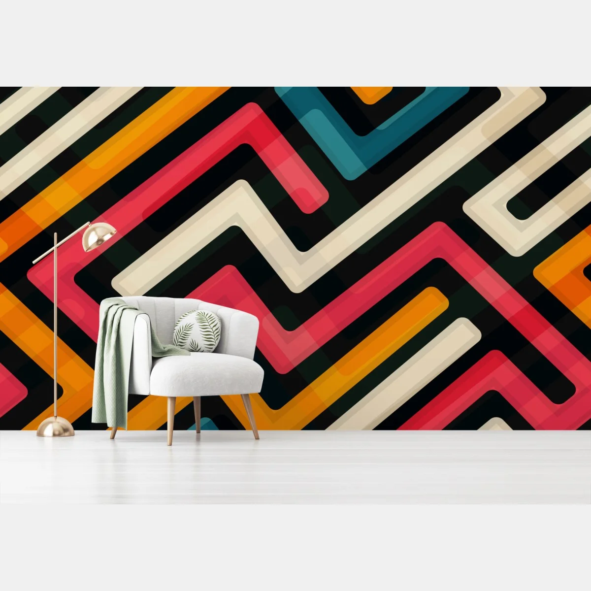 - wzór bezszwowy, geometryczny wzór, żywe kolory, nowoczesna sztuka, abstrakcyjny design, retro kolory, linie labiryntu, wyraziste kształty, kolorowa dekoracja, optyczna sztuka