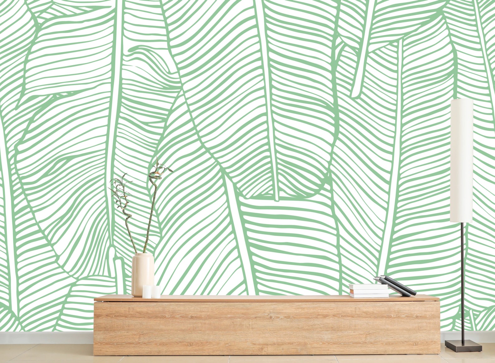 - dekoracja ścienna, botaniczny, wzór, minimalistyczny, natura, zielony, liście bananowca, tropikalne, roślinny, miętowy
