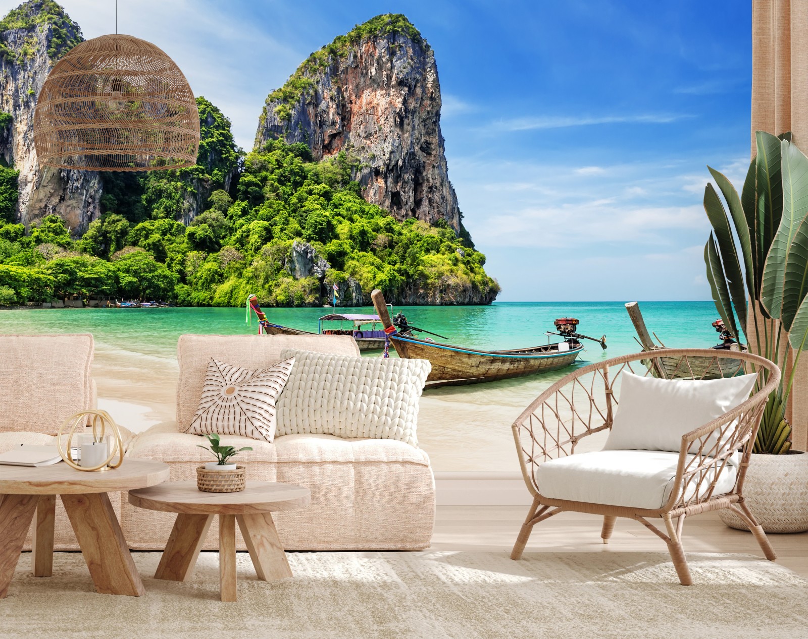 Fototapeta Spokojne łodzie longtail na plaży Railay, Tajlandia