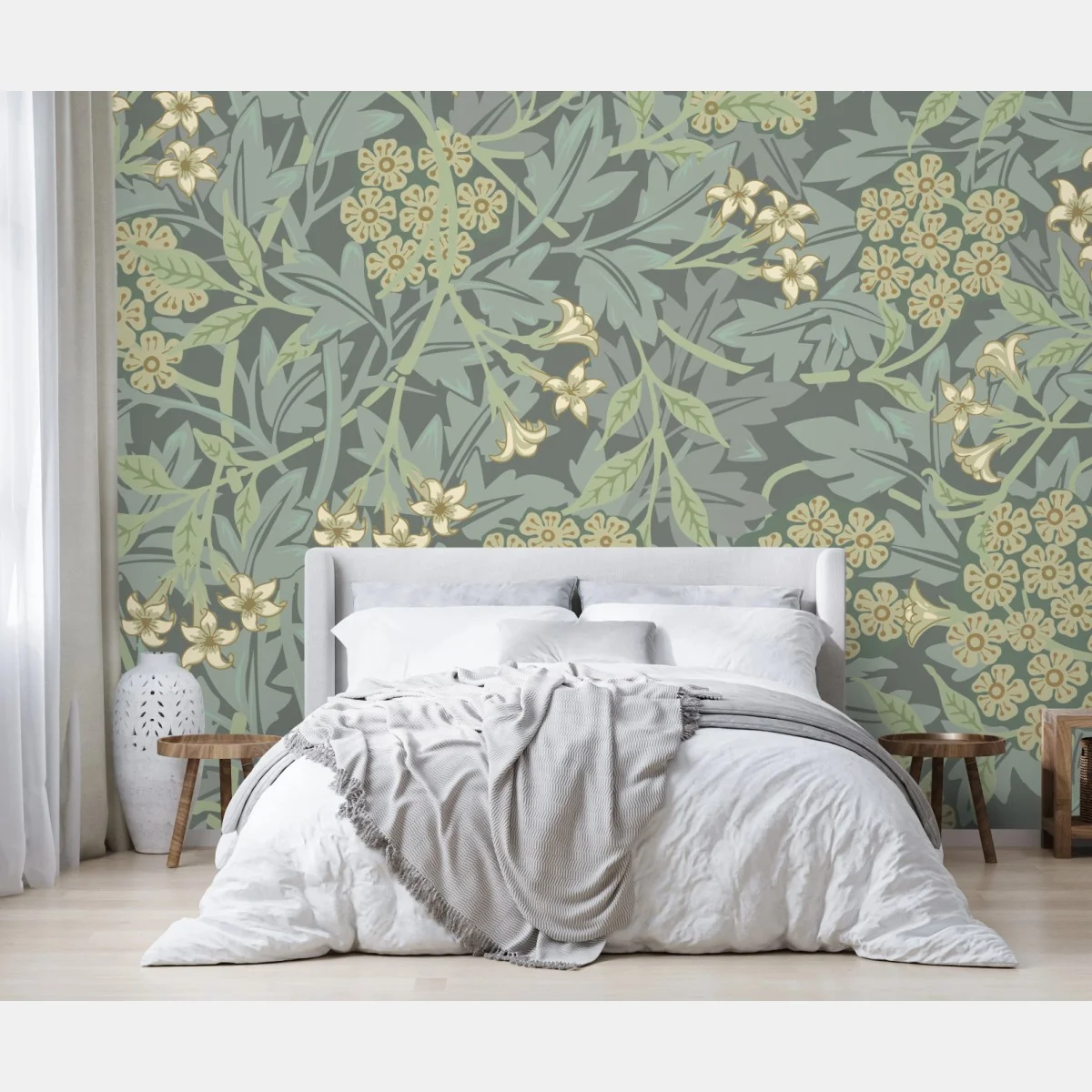- botaniczny, wzór bezszwowy, tapeta, kwiatowy wzór, pastelowa paleta, retro kwiaty, motyw liści, ozdobny wzór, stłumiona zieleń, beżowe kwiaty