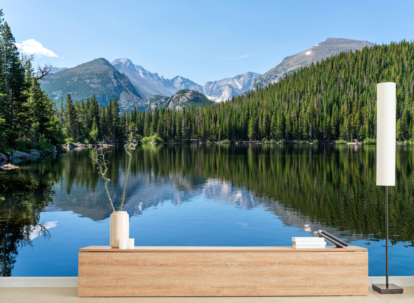 Fototapeta Górskie jezioro z odbiciem lasu i szczytów
