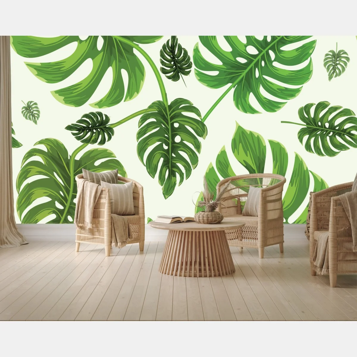 - monstera, dekoracja ścienna, botaniczny, natura, liście, bezszwowy, dżungla, tropikalne liście, rośliny, zielony wzór