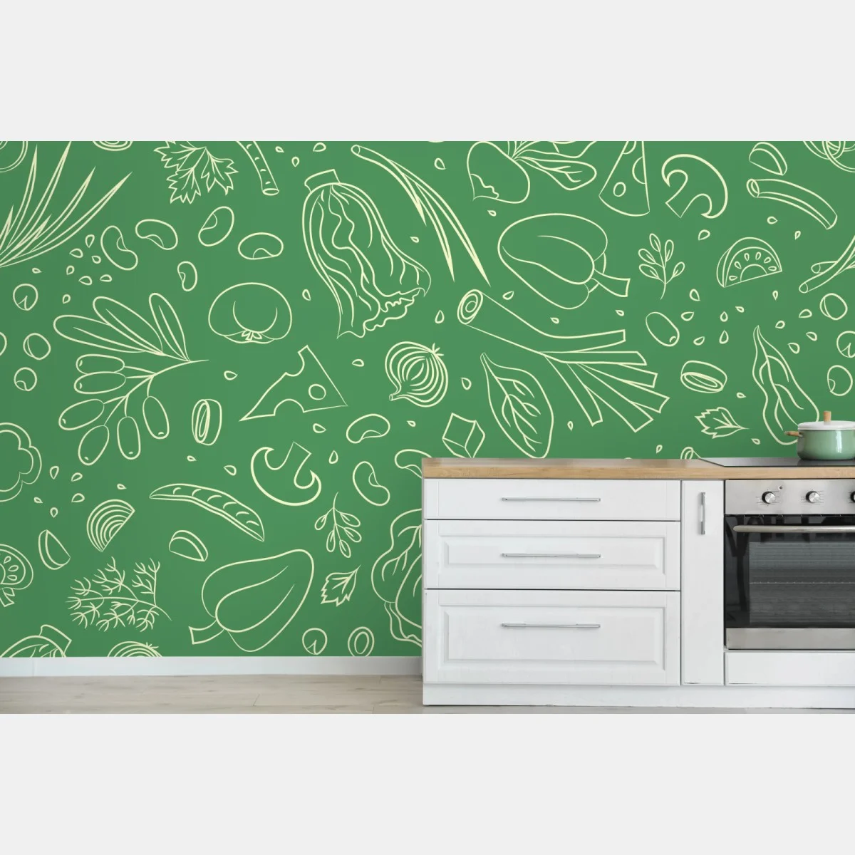 - wzór, bezszwowy, rysunek liniowy, warzywa, organiczne, dekoracja kuchni, gotowanie, zioła, zielone tło, sałatka