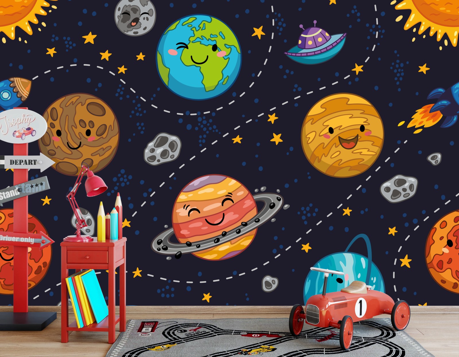 Fototapeta Uśmiechnięte planety na zabawnym tle kosmicznym