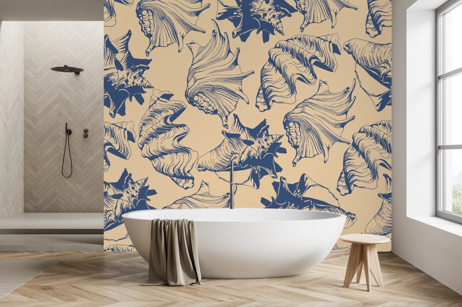 - ocean, ilustracja, wzór, bezszwowy, beżowy, granatowy, plaża, morski, muszle, muszle morskie