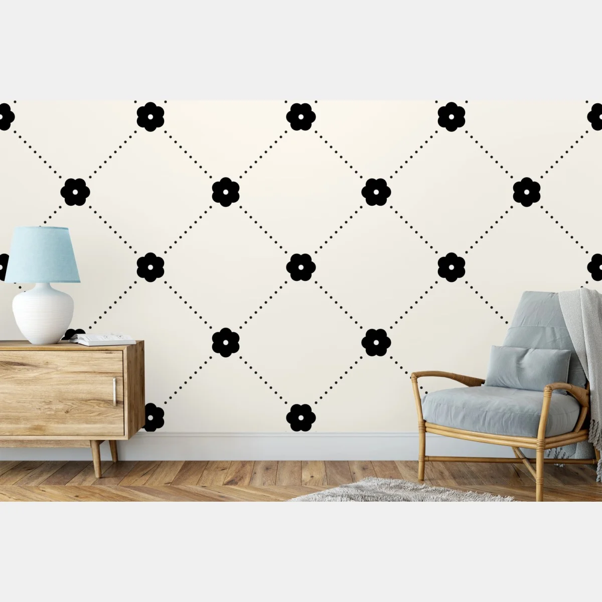 - ornament, geometryczny, minimalistyczny design, tapeta, kwiatowy wzór, bezszwowy wzór, kratka w romby, kropkowane linie, czerń i beż, retro szyk