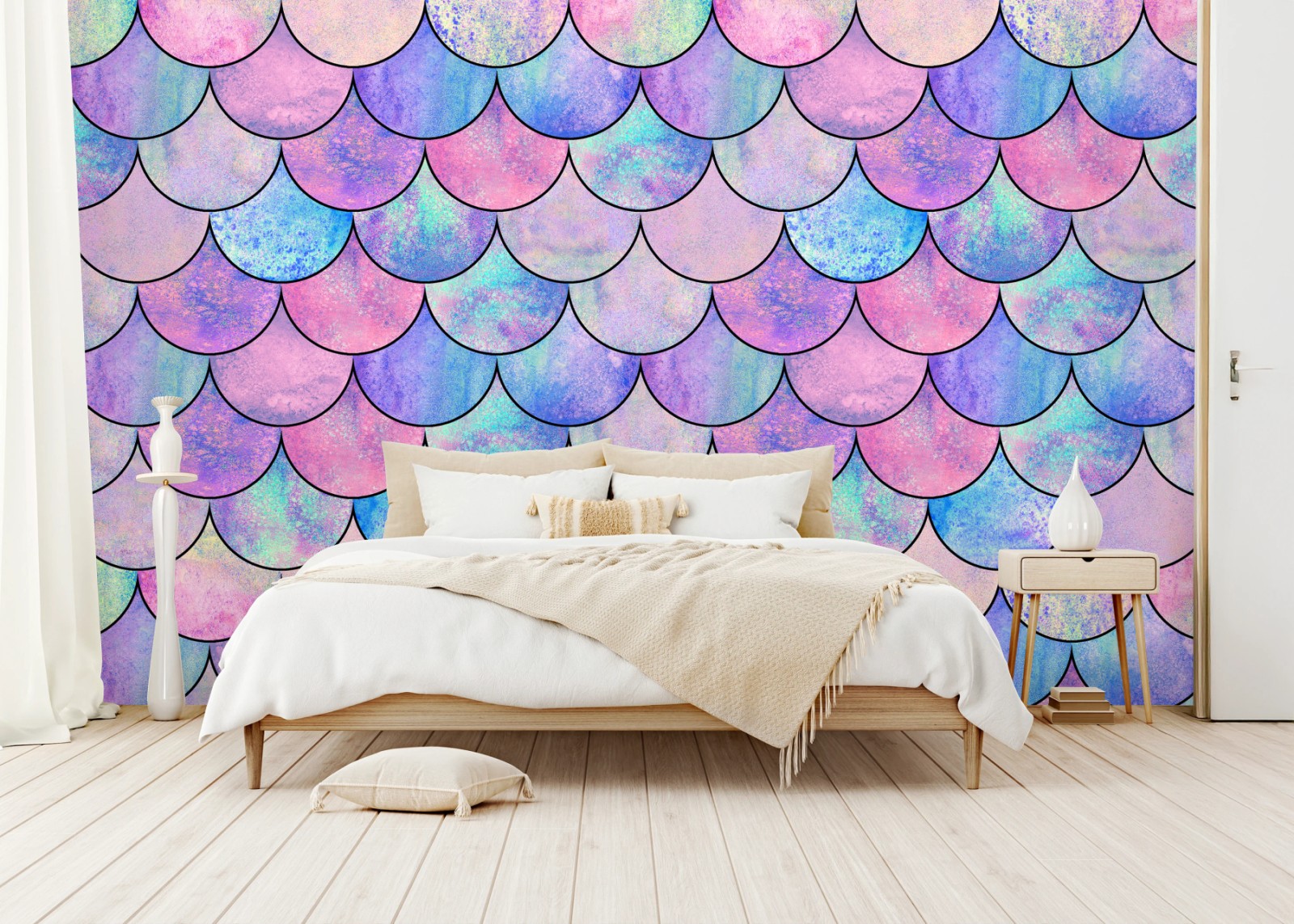 - turkus, zabawny, pastelowe kolory, łuski syreny, wzór łusek, pastelowy róż, pastelowy fiolet, tekstura akwareli, baśniowy, dziecięcy wystrój