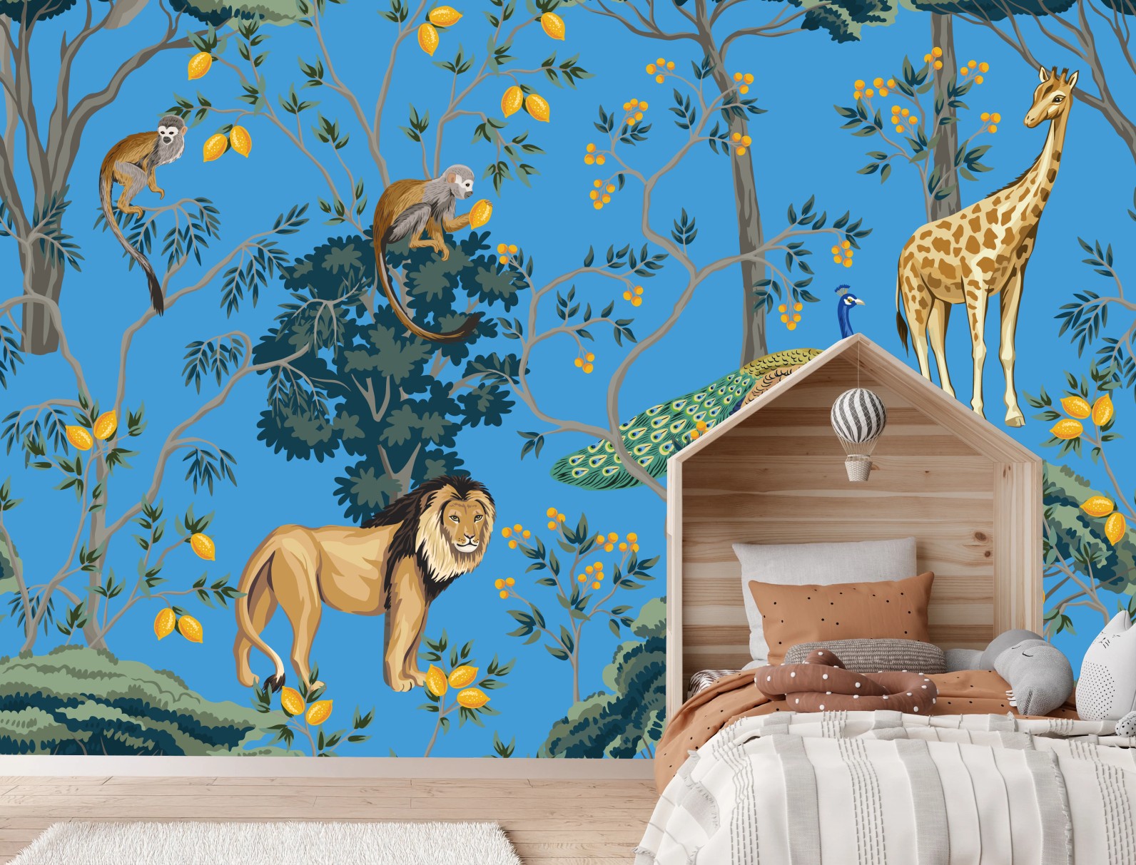 - zwierzęta, botaniczny, tapeta, egzotyczny, dżungla, lew, paw, żyrafa, małpy, niebieskie tło
