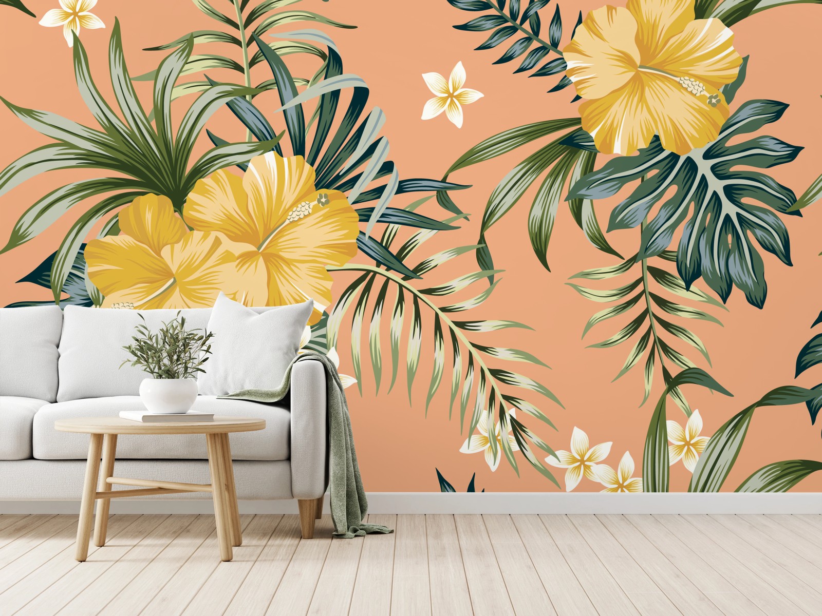 Fototapeta Tropikalny wzór z hibiskusem na brzoskwiniowym tle