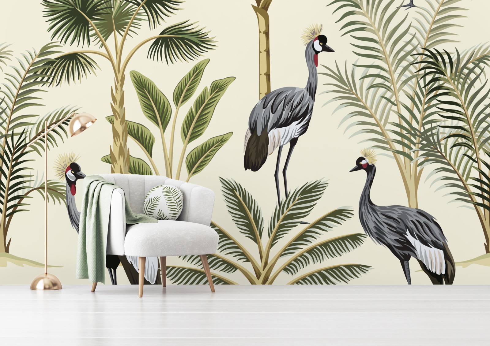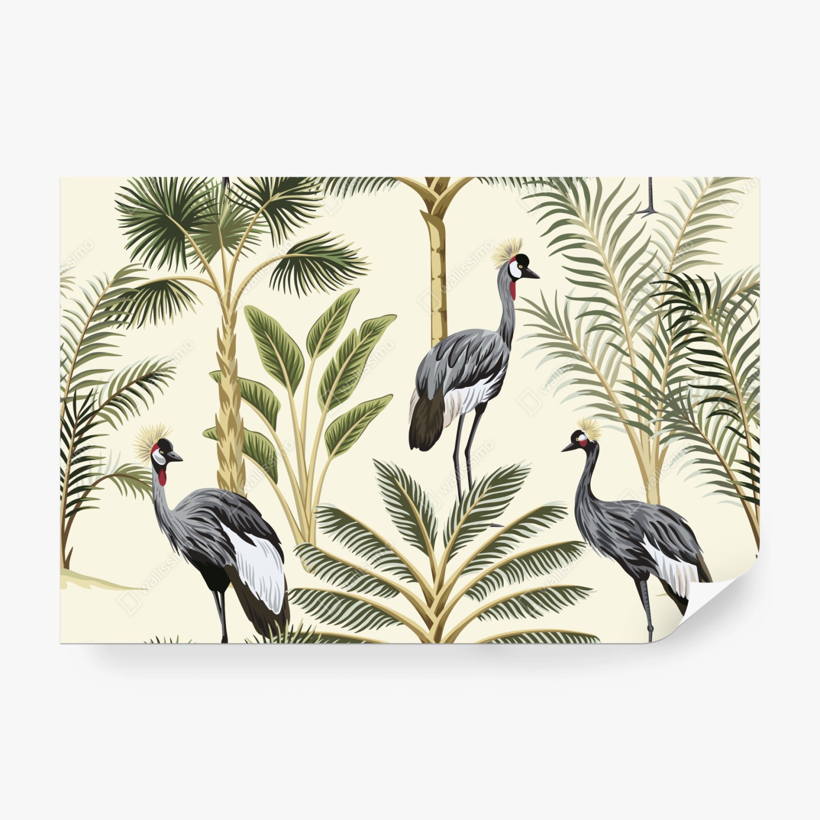 - ilustracja, botaniczny, natura, tropikalny, liście, dżungla, ptaki, beżowy, palma, żuraw